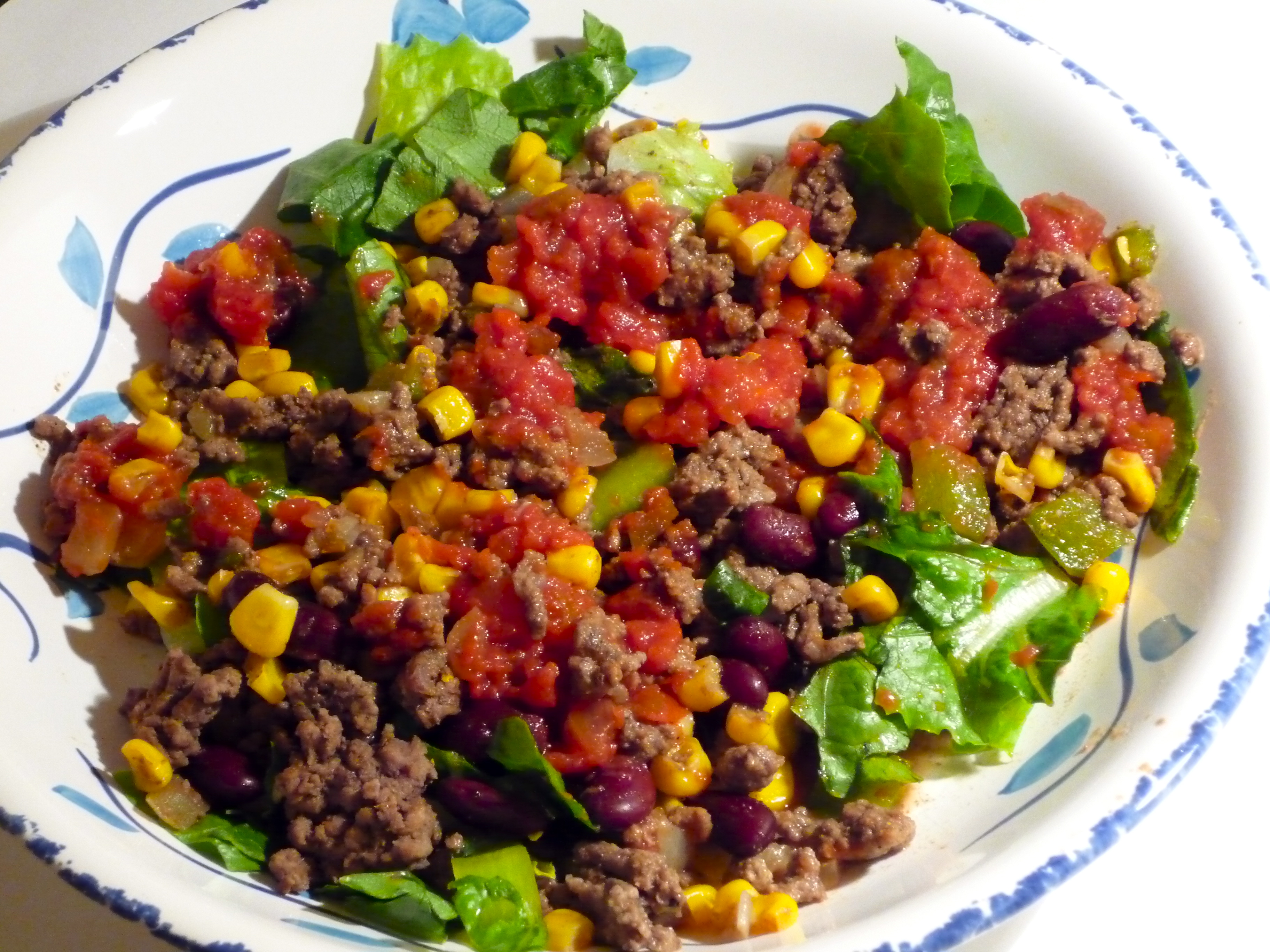 Saute the onion, green pepper, and ground beef in a frying pan until the veggies are tender and the beef is brown and cooked through. Sprinkle the taco seasoning on top (sometimes it’s helpful to add a tablespoon or two of water). Add beans and corn, heat through. Put around a cup of the taco meat on some romaine lettuce, mix in some salsa, and enjoy!