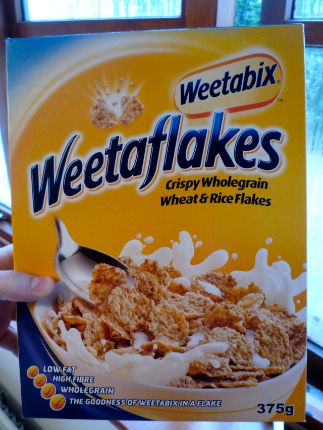 Ok, so, these Weetaflakes are AWESOME! My favorite cereal in the U.S. is Special K, but it being about 3 pounds per box over here, I’m not going to buy it unless it’s on sale. This box of cereal was less than a pound at the 99p store! (The 99p store is like a dollar store. Oh, and 1 pound = roughly $1.61! Yikes!) High fiber and protein, low fat and calories, and whole grain? Sure! If you wanted to make this breakfast gluten free, you could easily swap Corn Flakes, Rice Chex, etc. in place of this cereal, and if you wanted to make it dairy free, just use only rice milk.