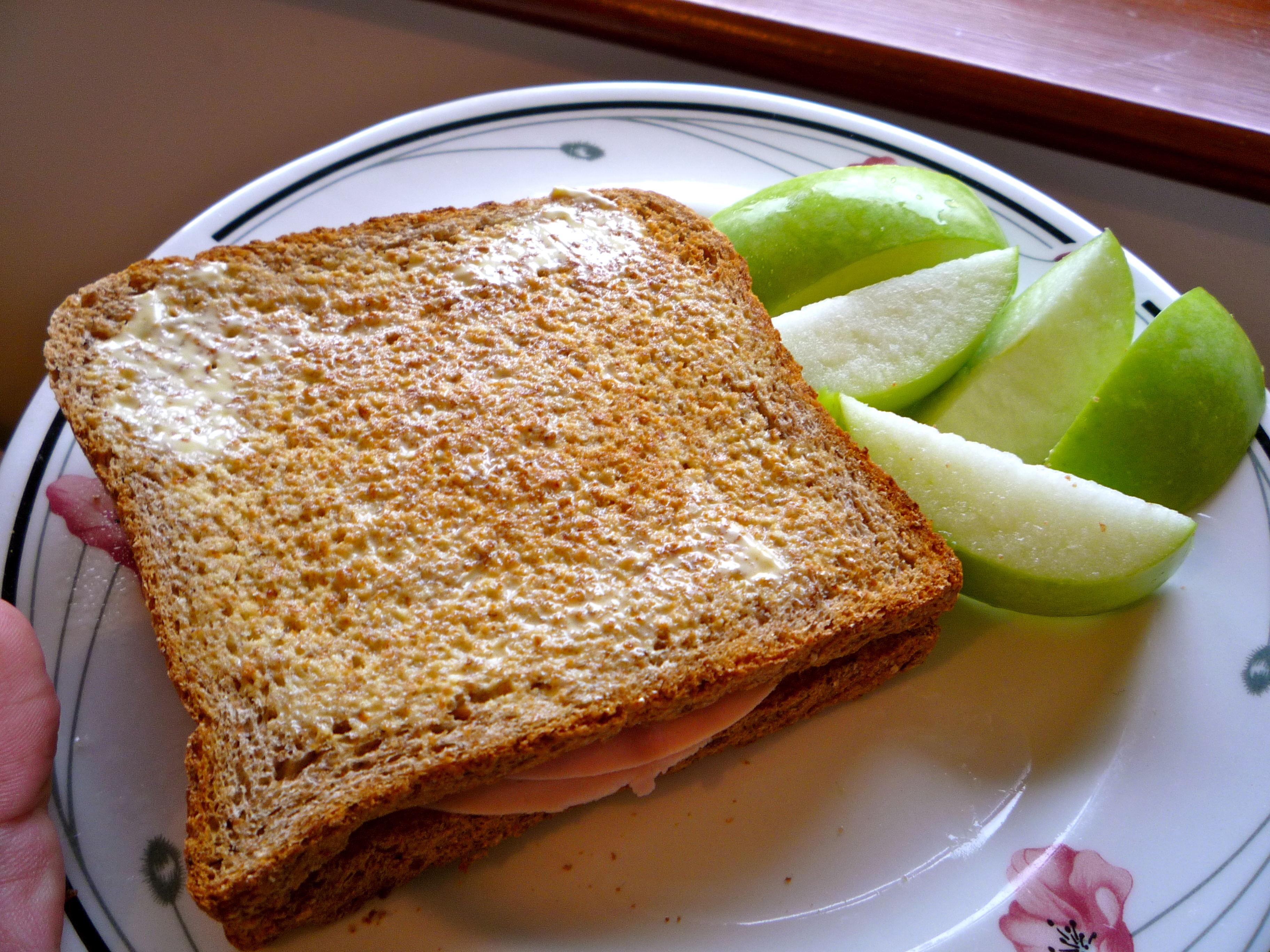 Ham, cheese, and sliced Granny Smith apple sandwich. Normally I grill this up like a panino, but since I was running late, I just popped the bread into the toaster instead.