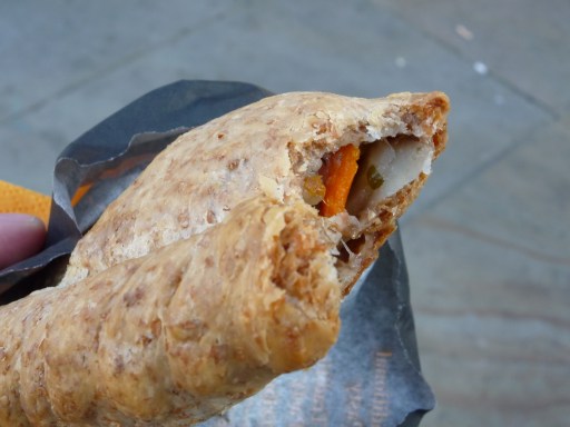 A pasty from West Cornwall Pasties. When I was here four years ago on a family vacation, this was my family’s favorite stop for a quick lunch. That was when we thought I wasn’t allergic to eggs anymore, so the egg-wash they use on the crusts didn’t both me. Â Now, however, it would, and I was heartbroken to think I’d have to come to England without getting a pasty! But, lo! They have a vegan type! Wholemeal Vegetable! Very delicious. I only ate about half, because they’re filled with fat and uncomplex carbs