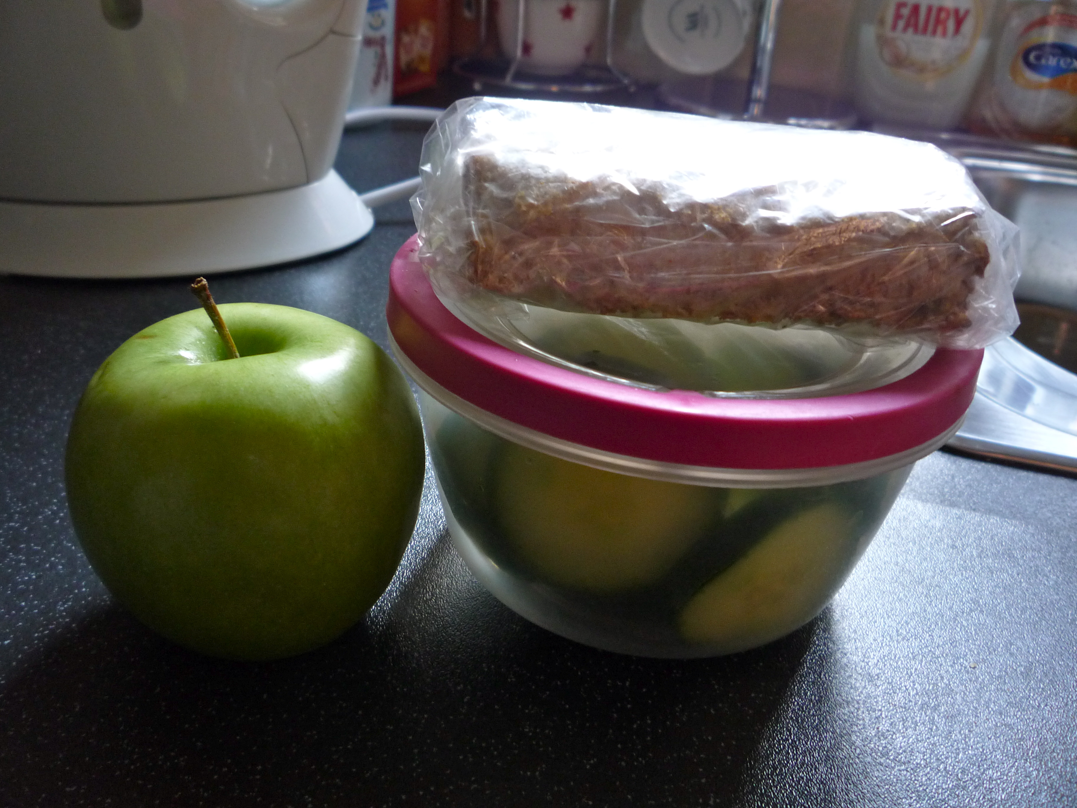 I had a 2-hour lecture, and then I enjoyed my lunch, which was some cucumber slices, an apple, and a ham and cheese sandwich on whole wheat bread.