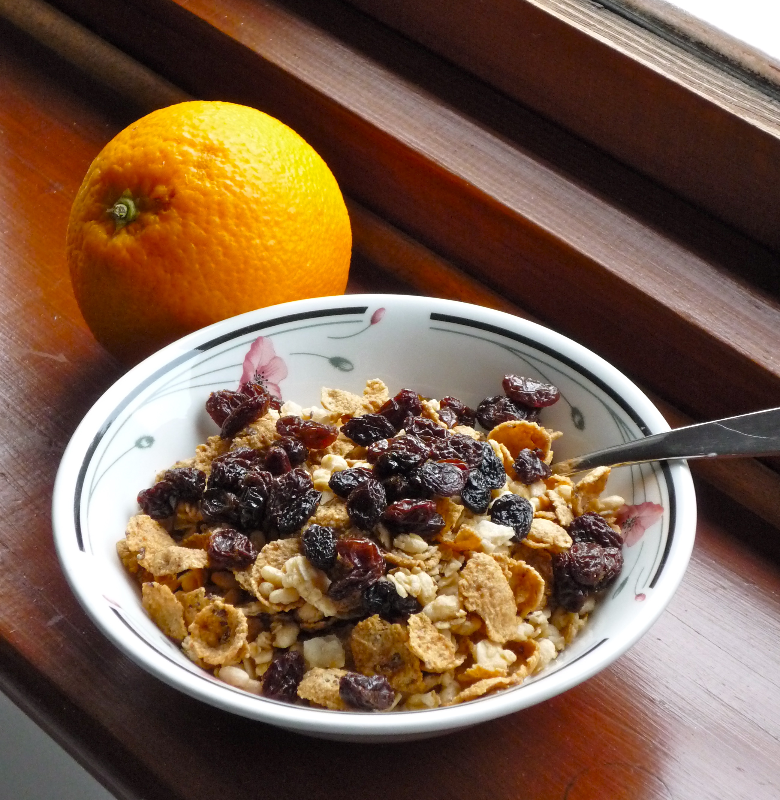 An orange, obviously, and some cereal on top of about 3 oz. of Greek yogurt. This cereal is also from the 99p store, and is more like a granola than a cereal (see pre-Dinner below). I topped it off with raisins. It was a very calorie- and carb-packed meal, but that’s because…..