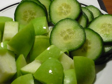 A very greeeeeeeeen plate of Granny Smith apple and a cucumber.