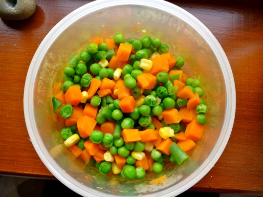 Half a chicken breast (I sprinkled pepper, garlic salt, and cayenne on it), some mixed veggies, and homemade chips.