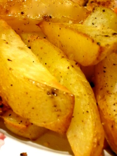 Preheat oven to 400*F. Cut up potato into “chip” (= fry in American) style pieces. Toss in olive oil, salt, and pepper, and put on a foil lined baking sheet. You might want to spray your foil first if it isn’t already non-stick. Roast potatoes in oven for about 20 minutes, flipping once, until chips are “fork-tender”. Enjoy!