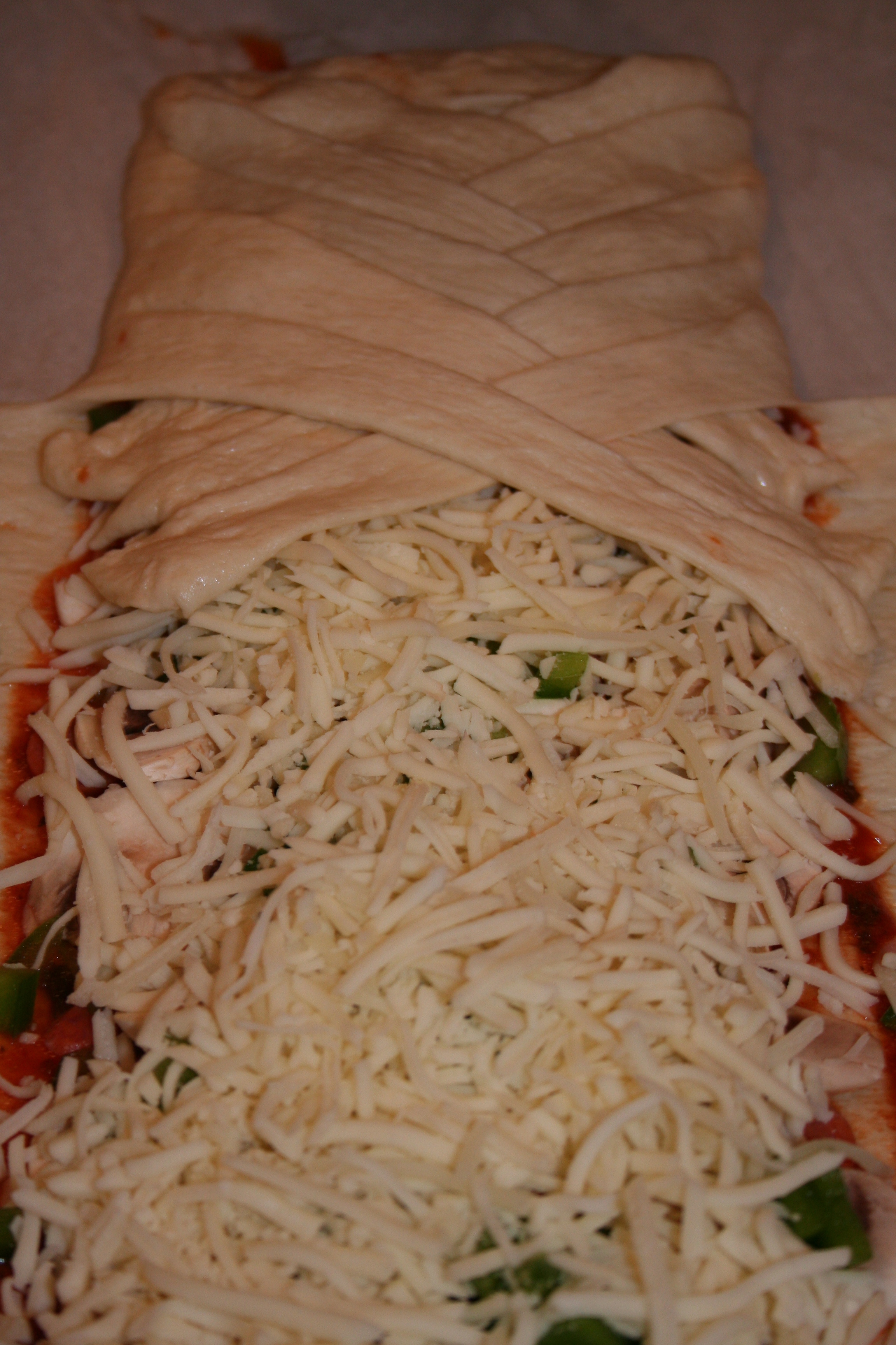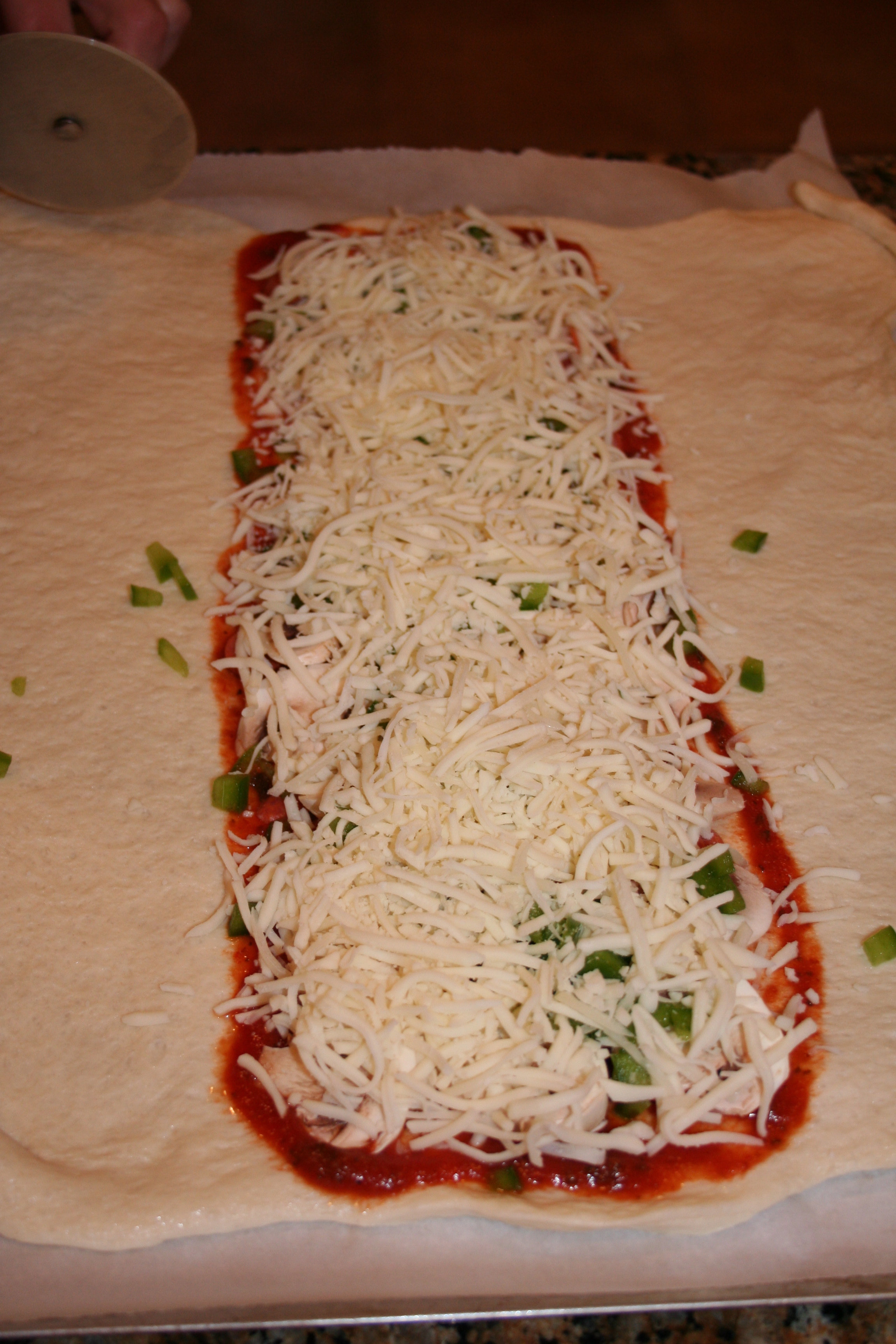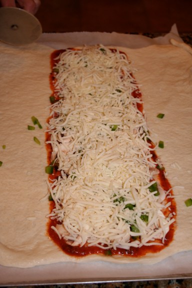 - Using a pizza cutter, slice strips starting at side edges of dough, and ending about an inch from the toppings.