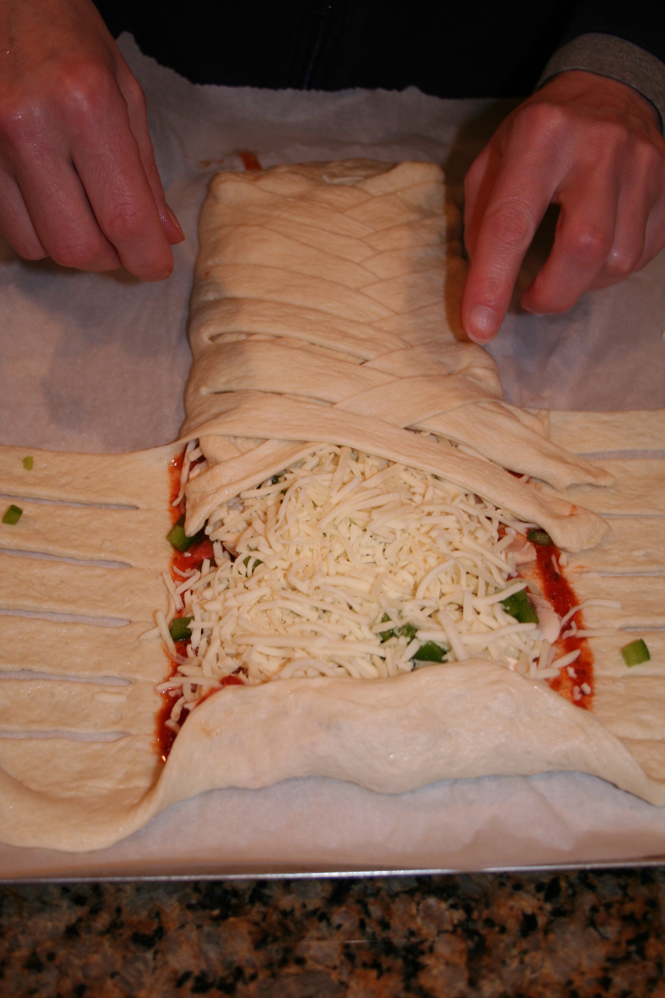 - Fold the end that is closest to you over the toppings. Next, crisscross the strips over the pizza, alternating sides, until you reach the last two strips.