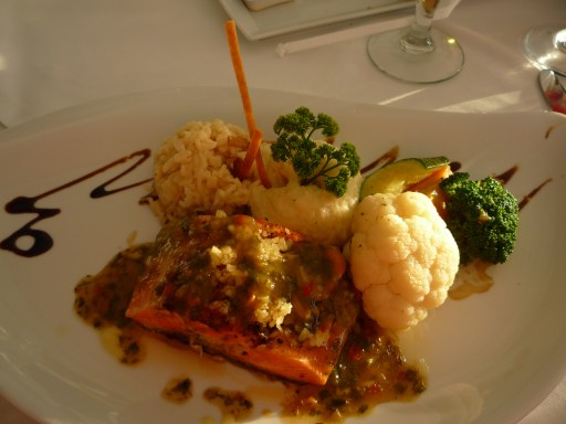 For my entree, I ordered the salmon, which came with steamed veggies and a salsa verde.