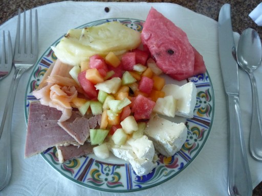 Fresh fruit, sliced ham, smoked salmon, and brie cheese. And to finish off, a cappuccino!