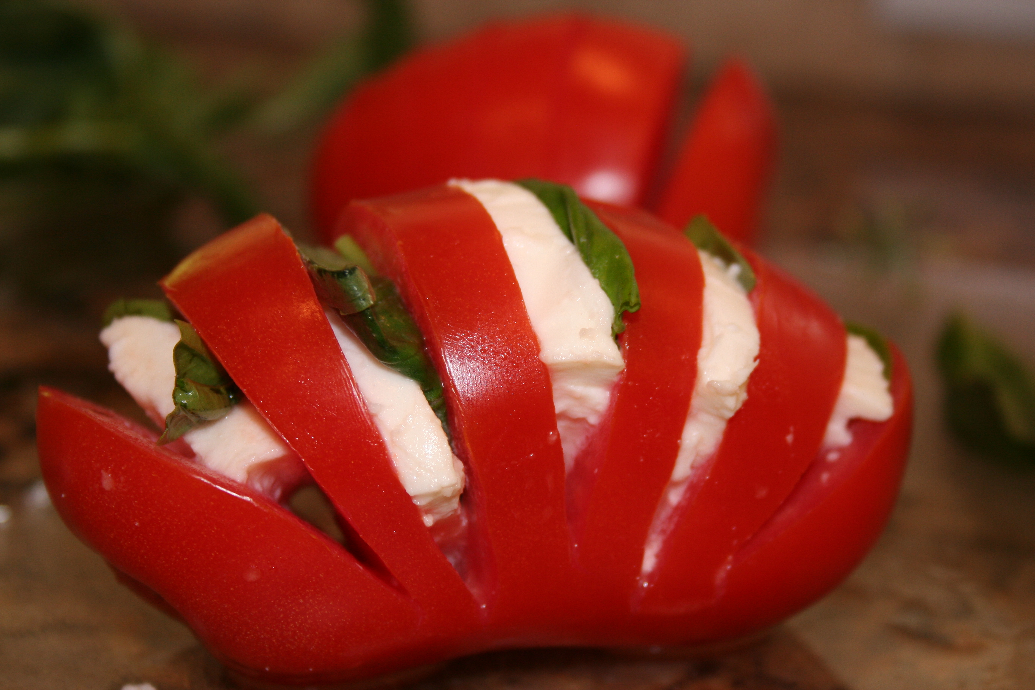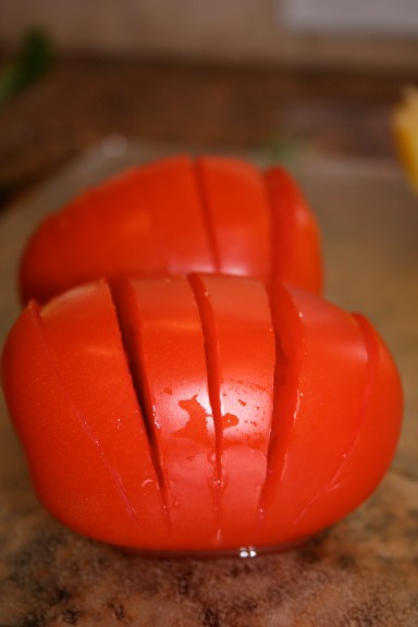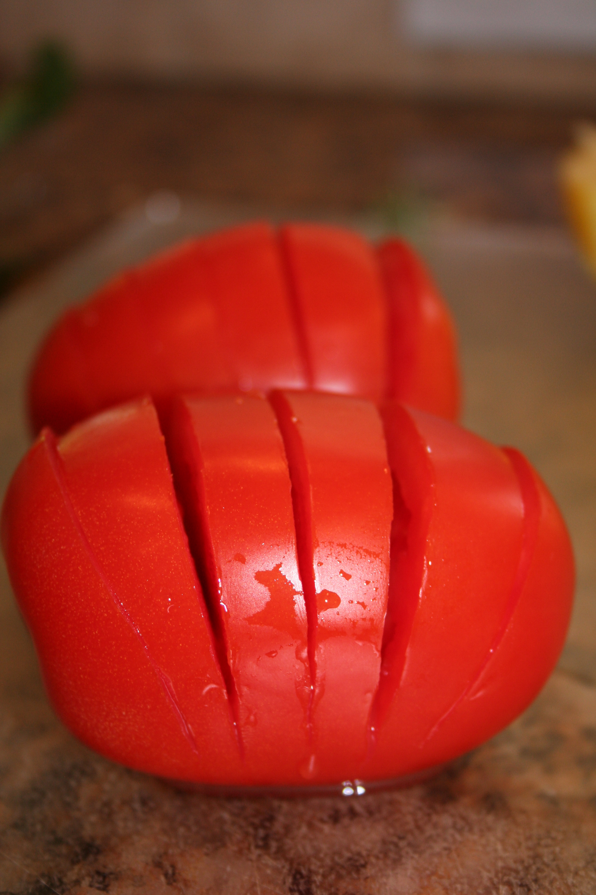 - After washing them off, cut about five or six slits into each tomato, making sure not to go all the way through (you’ll want them to sort of fan open).