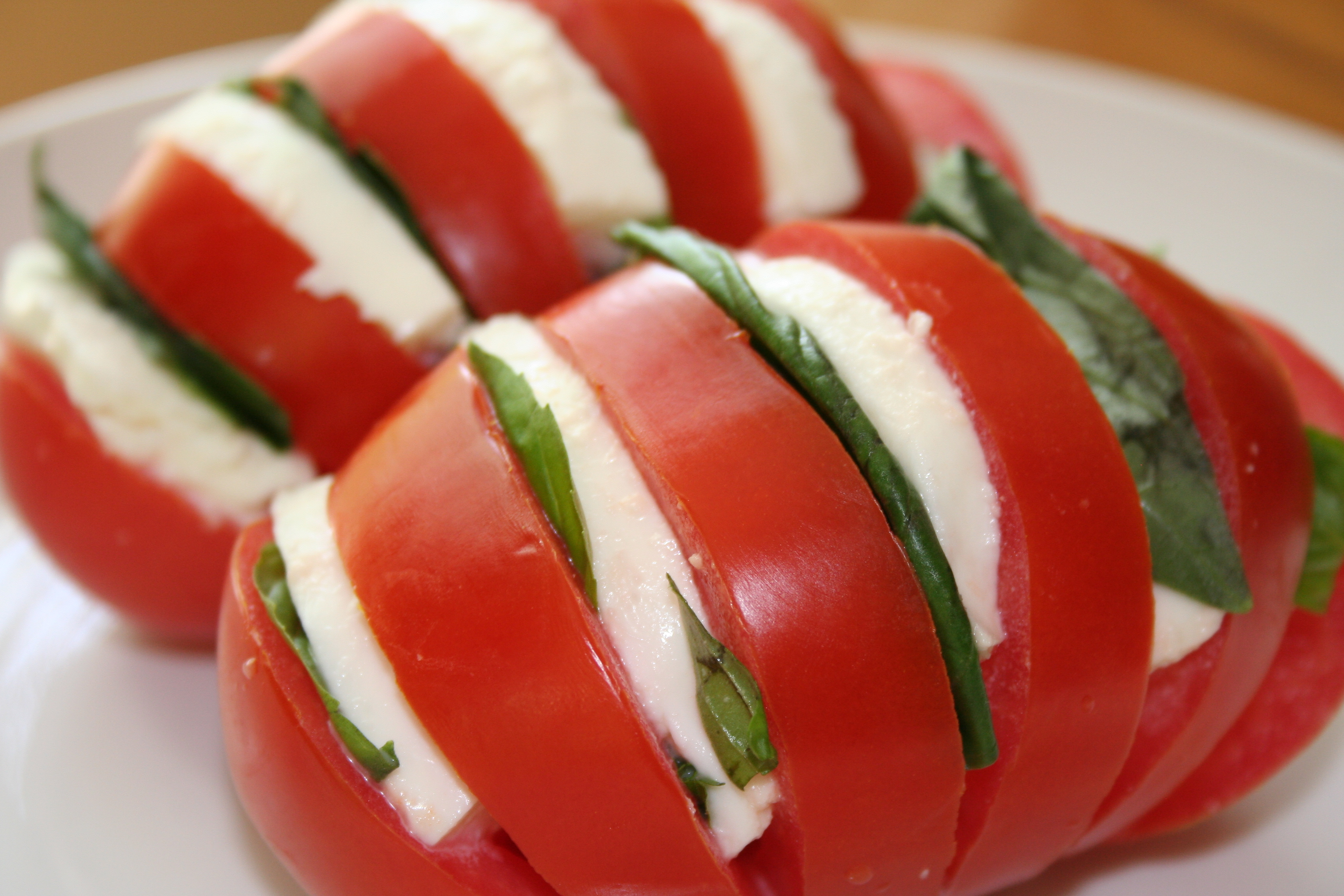 - Next cut the mozzarella into a good size/shape to fit into the tomato. Mine were in triangles, and I put the point down first, so the rounded edge of the cheese matched that of the tomato.