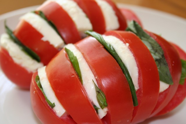 - Put the basil next to the cheese. You can leave the leaves (har har) whole or tear them, depending on the size you want.