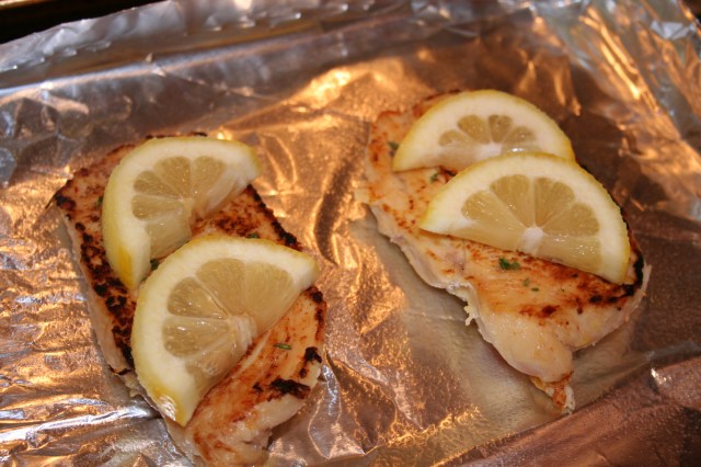 - Sprinkle the other 1/2 tsp. rosemary over the top, and place two lemon slices on each chicken breast.