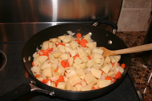 - Next, melt butter in a large skillet. Add the potatoes, carrots, and onion. Salt to taste.