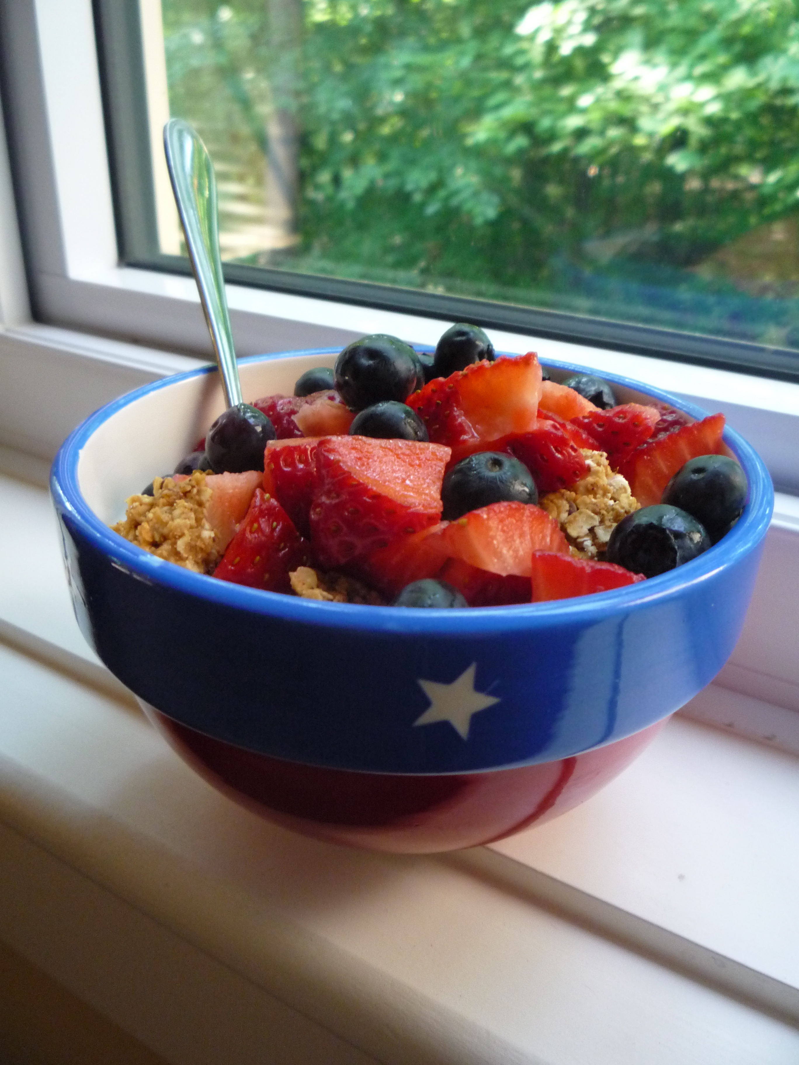 Fage 0% Fat Greek Yogurt + granola + fruit. (Like the patriotic colors? I actually took this picture on Memorial Day, but it’s basically what I had yesterday. 😉 )