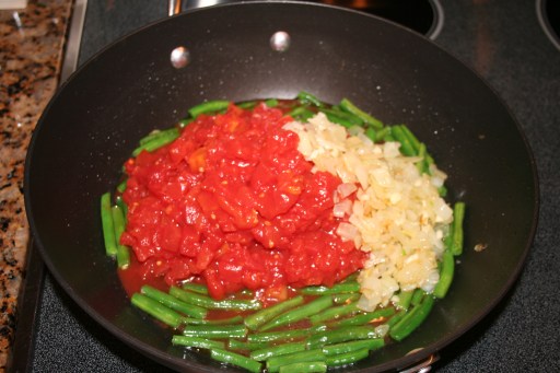 - Remove onions from pan and set aside. Add green beans and saute for about 4 minutes.