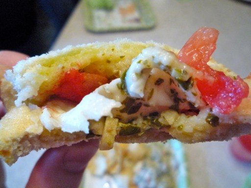 To make the Caprese panini, I spread a store-bought pesto (that obviously didn’t have nuts!) on both pieces of bread. I then layered sliced Roma tomatoes and fresh mozzarella, and cooked them in a panini press! They smelled soooo good as they were cooking, and I thought they tasted pretty good, too!