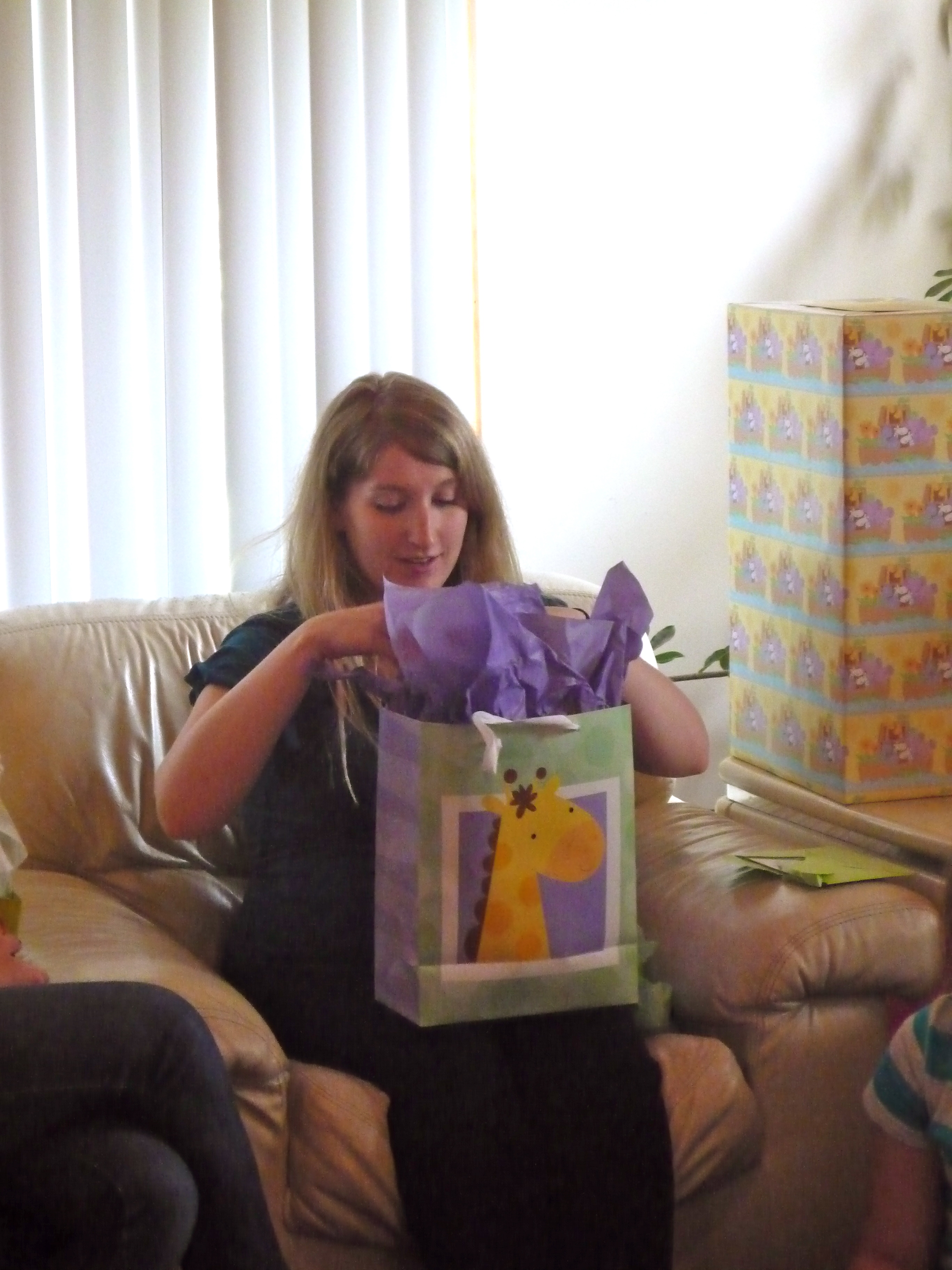 And my mom got her an assortment of things, like newborn hats/socks, sippy cups, a teething ring, a crib sheet, and a little giraffe blanket. 🙂