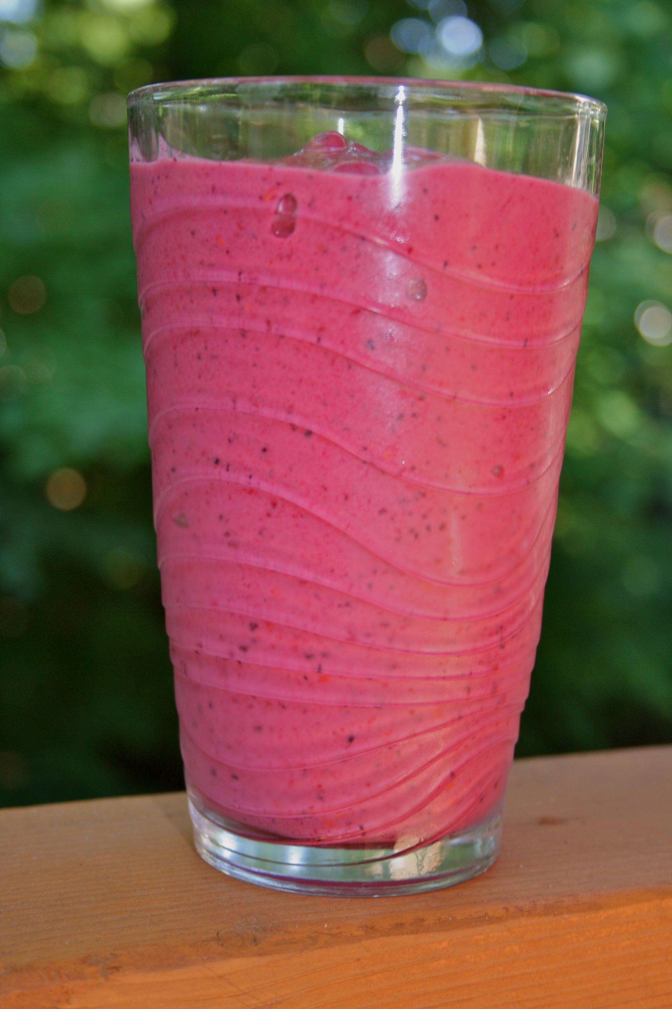 A protein smoothie made with mixed berries instead of strawberries. Isn’t that color amazing? Berries are one of my favorite summer staples. You just can’t beat fresh picked raspberries, strawberries, or blueberries. 🙂