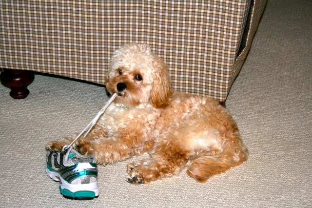 Ella would be happy if I gave my old running shoes to her! (She grabbed this one when I wasn’t looking.)