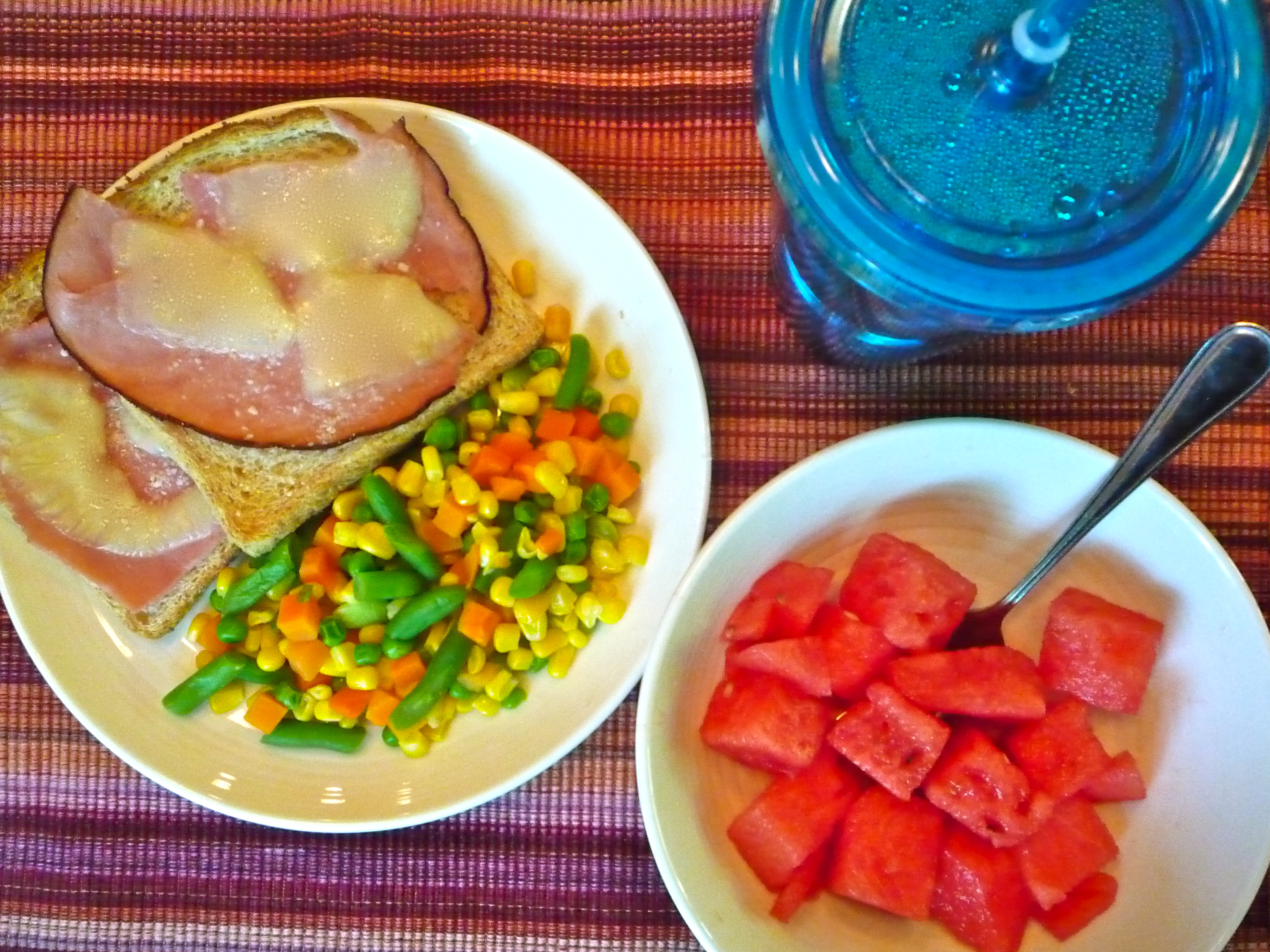 Two open-faced ham and cheese sandwiches, drizzled with honey, mixed veggies, and watermelon (another great summer staple!). Not exactly an elegant dinner, but it was very good!