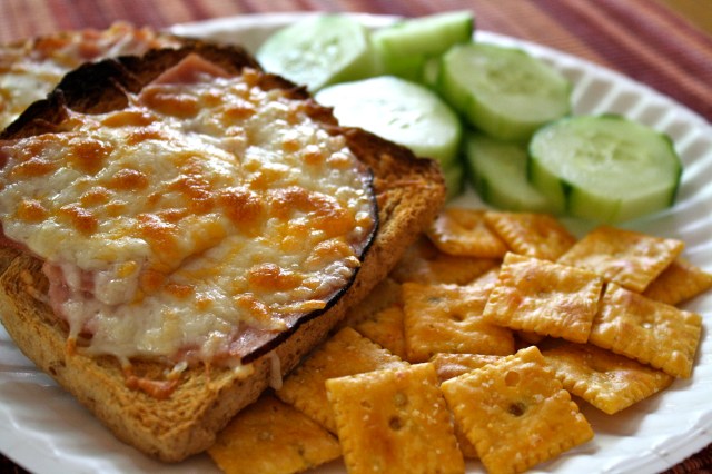 Open-faced ham and cheese melts (with a drizzle of honey on top – is that weird?), cucumber (also from the farmer’s market), pepper jack cheese crackers, and an un-pictured nectarine.