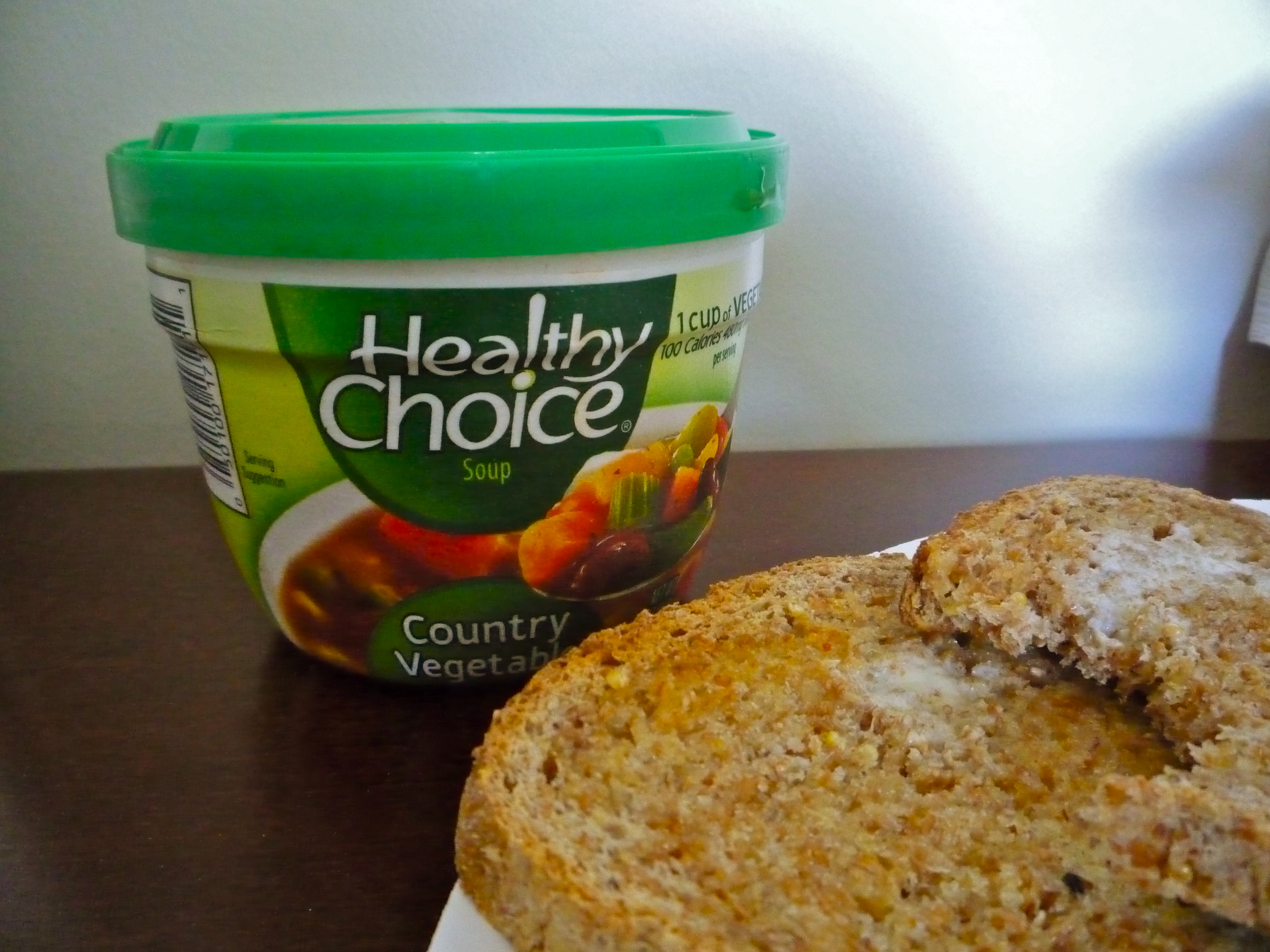 A can of vegetable soup into which I threw some cubed tofu. The tofu was leftover from last week – I have a good Meat Free Monday dish to share with you soon! On the side, I had two slices of Ezekiel 4:9 bread. Despite the fact that half of it came from a can, this meal was actually really delicious!
