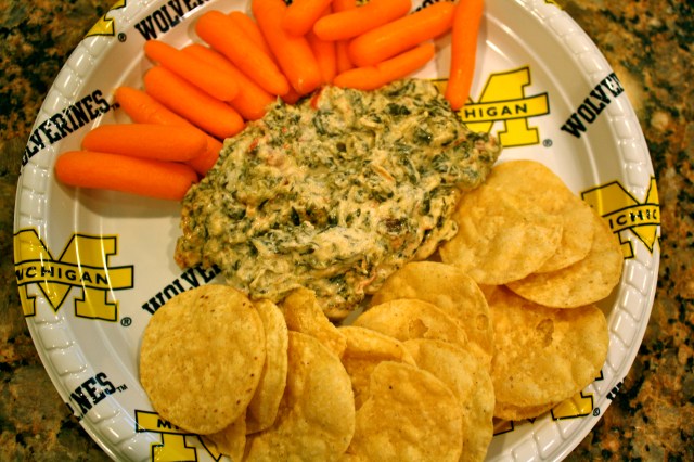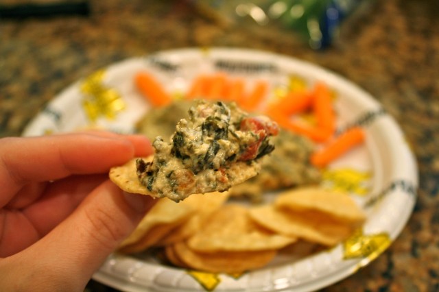 When everyone started to arrive on Saturday, our kitchen quite literally turned into a snack bar. I’m guessing we had close to 10 chip bags, 2 dips, homemade guacamole, a veggie tray, and a few other odds and ends. It was nuts, but everything was sooooo delicious! I’m a horrible blogger and didn’t get a picture of it all, but what I did manage to snap a picture of was my mom’s spinach dip. This is a family favorite (on both sides), and the recipe has been passed around more times than you could count.