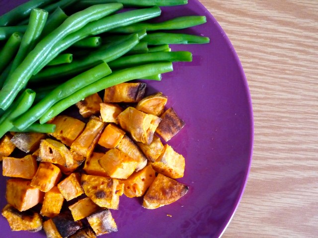 Because of that protein that I had for breakfast, I wasn’t super hungry when lunch rolled around. Of course, “lunch” time was at around 11:00 for me (just four hours after breakfast), so it’s no wonder I wasn’t. What I ended up doing, though, was simply cooking up some sweet potato (that I peeled and cubed over the weekend – easy!) and microwaving some green beans (which I had pre-steamed over the weekend as well).