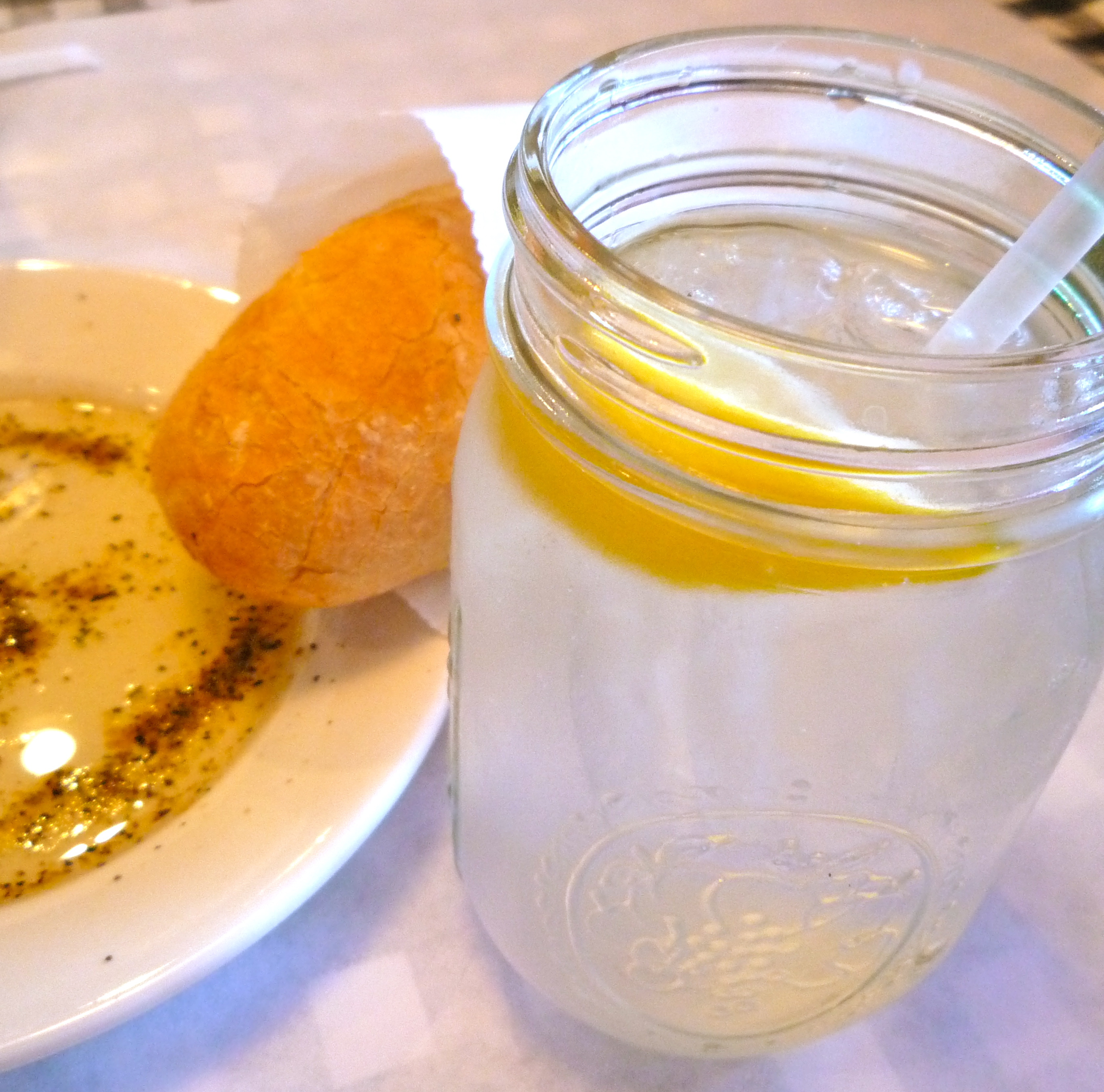 We started off with some bread + olive oil, and looooooots of water for me (to sooth my throat…does anyone have any suggestions on how to make a sore throat feel better?). I love the fact that they serve it in Mason jars! So cute!