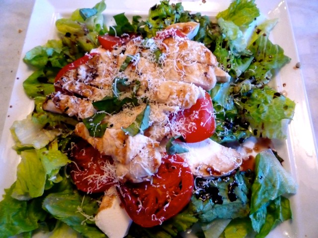 For my dinner I ordered the Caprese Salad, which was a bed of romaine topped with tomato, fresh mozzarella (YUM), chopped basil, and chicken. The dressing was, of course, olive oil + balsamic vinegar.