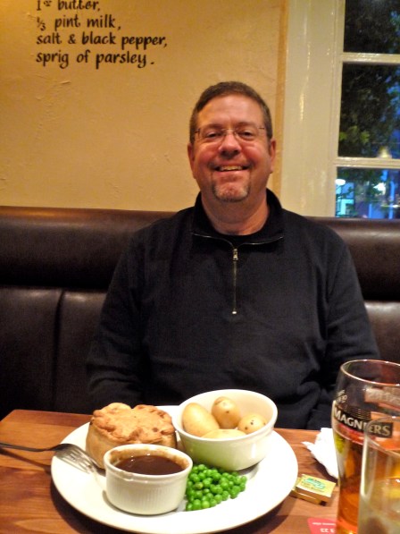 Anyway. Obviously, when in London, you need to go to a pub. My dad and I stopped at one of the first pubs that we saw, which was called O’Neills. It became a favorite of mine while I was there. My dad loves traditional pub grub, and so ordered the steak and Guinness pie, which came with an ale gravy of sorts and potatoes and peas.