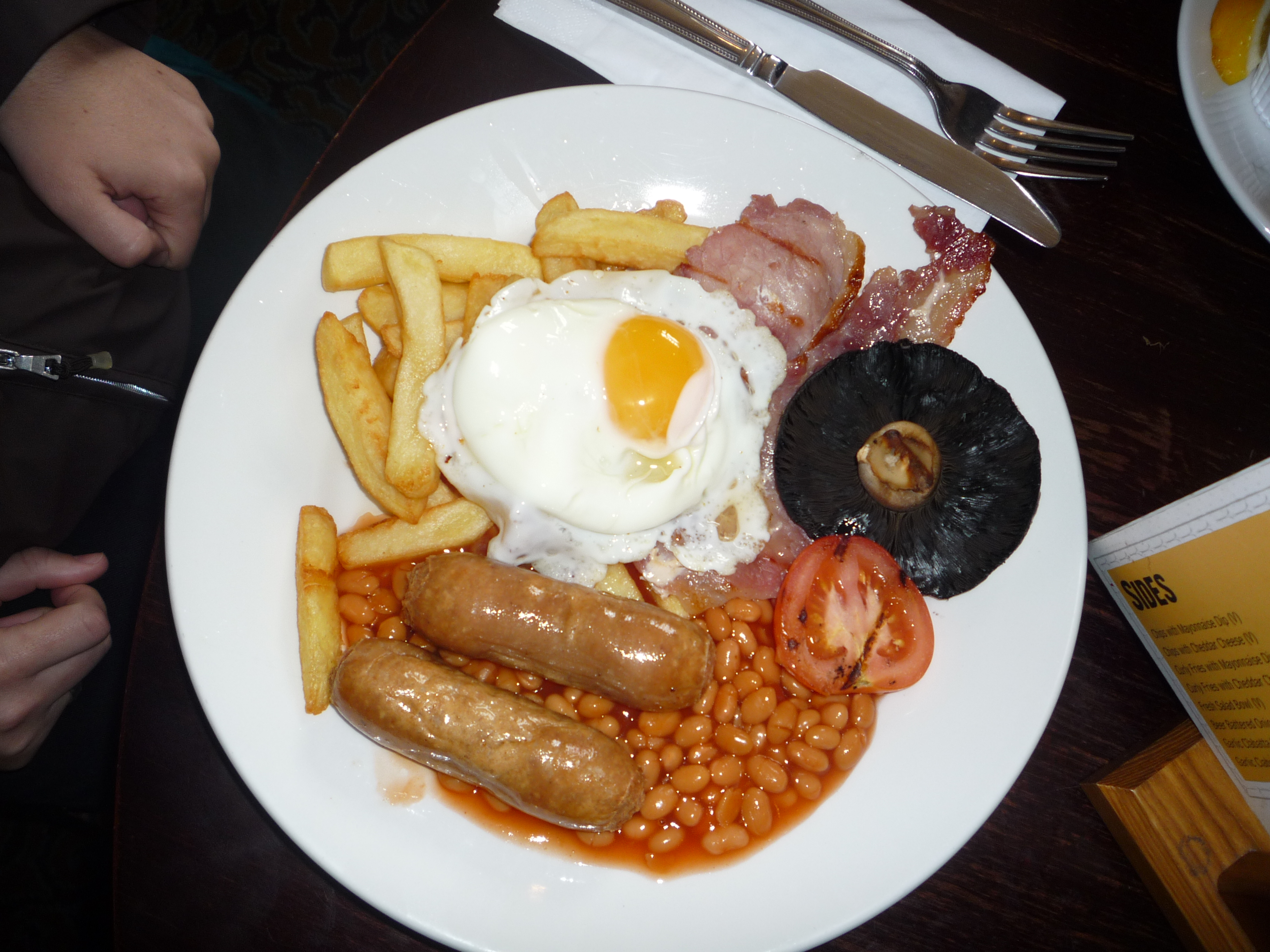 So, instead, my friends Kim and Nancy and I wandered around for a bit in search of food. We found a tiny pub, and Kim ordered a traditional English breakfast, which I just had to get a picture of: