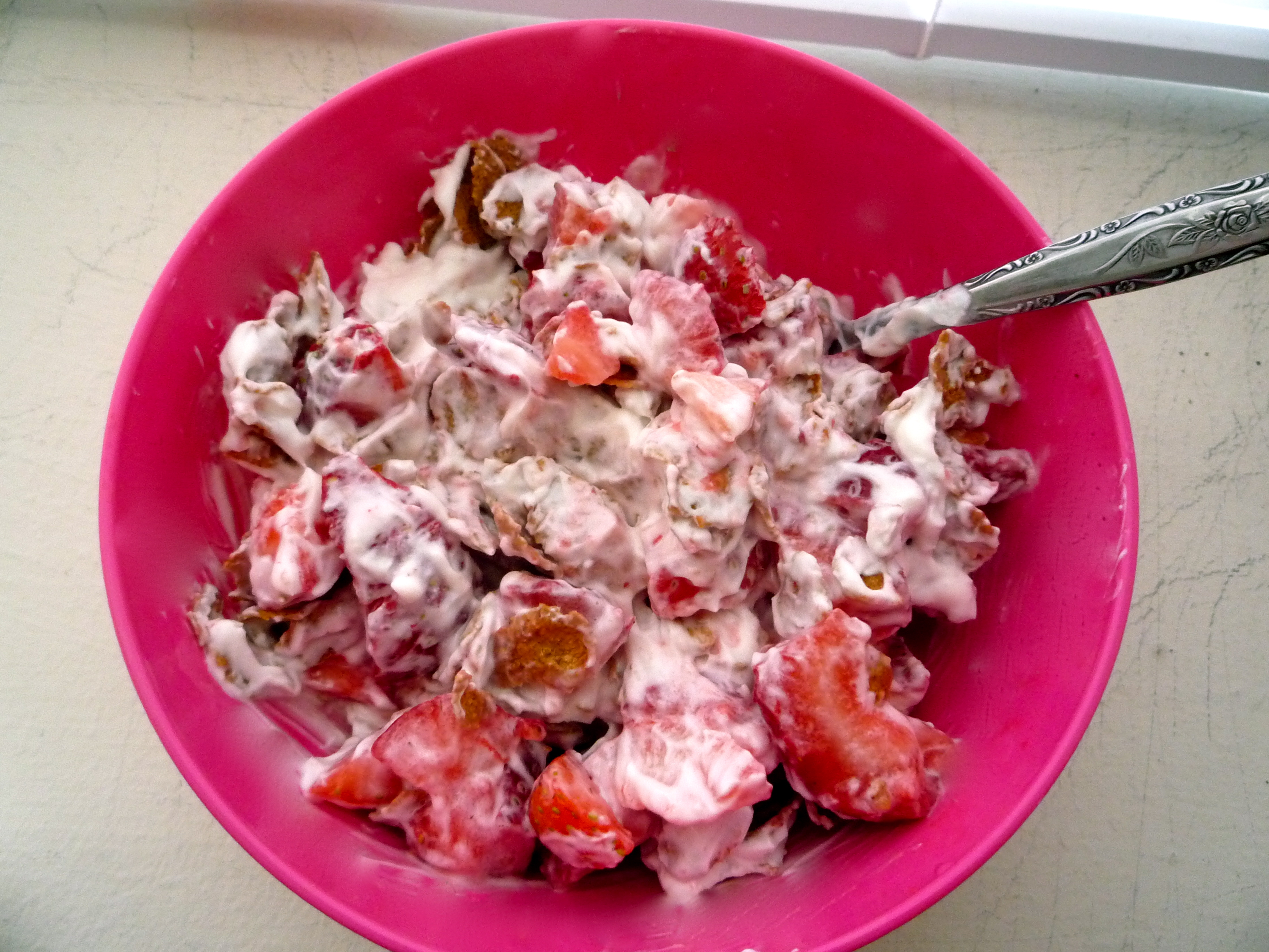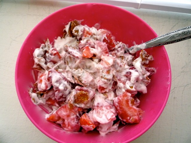 Yeah. Greek yogurt + granola/bran + strawberries. I think these were some of the last strawberries of the season. They weren’t great and they went bad really quickly. But mix them up with some Greek yogurt, and problem solved!