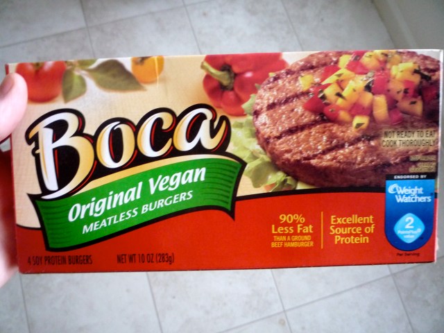 I also tried something new this week: Boca Burgers. While shopping the other day, I remembered that I needed to pick up something healthy/filling but quick for the days that I only have 45 minutes to prepare and eat lunch. I’d heard of Boca Burgers , but for some reason had never seen the “vegan” type before, and hadn’t ever tried them.