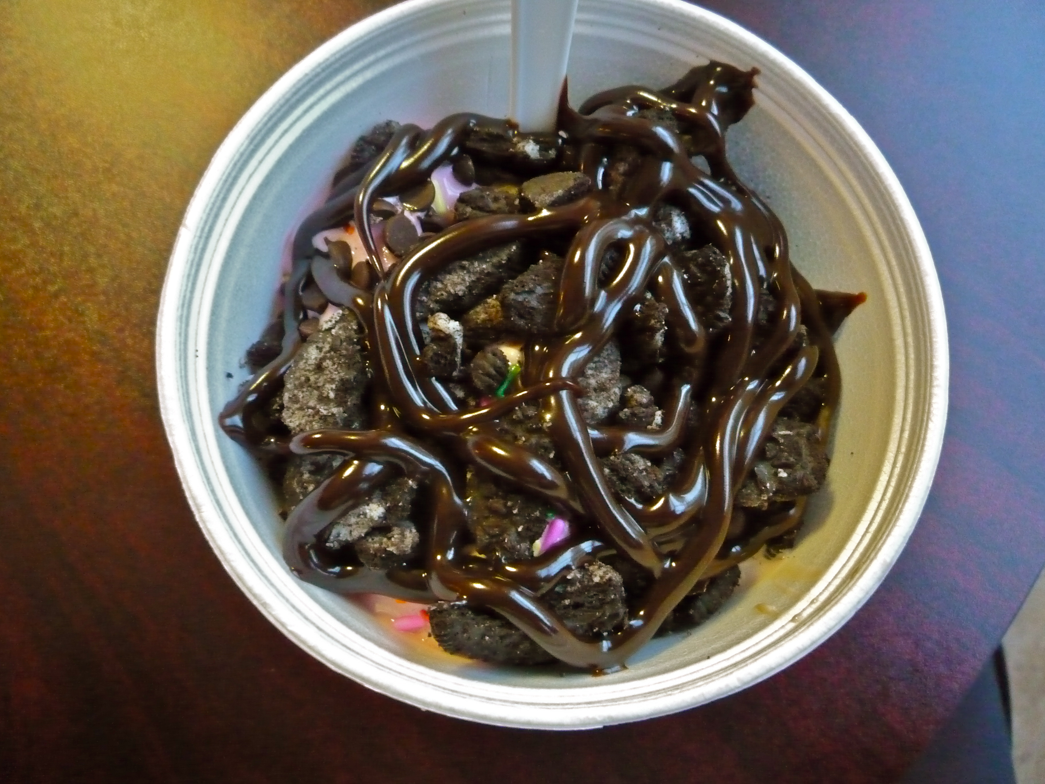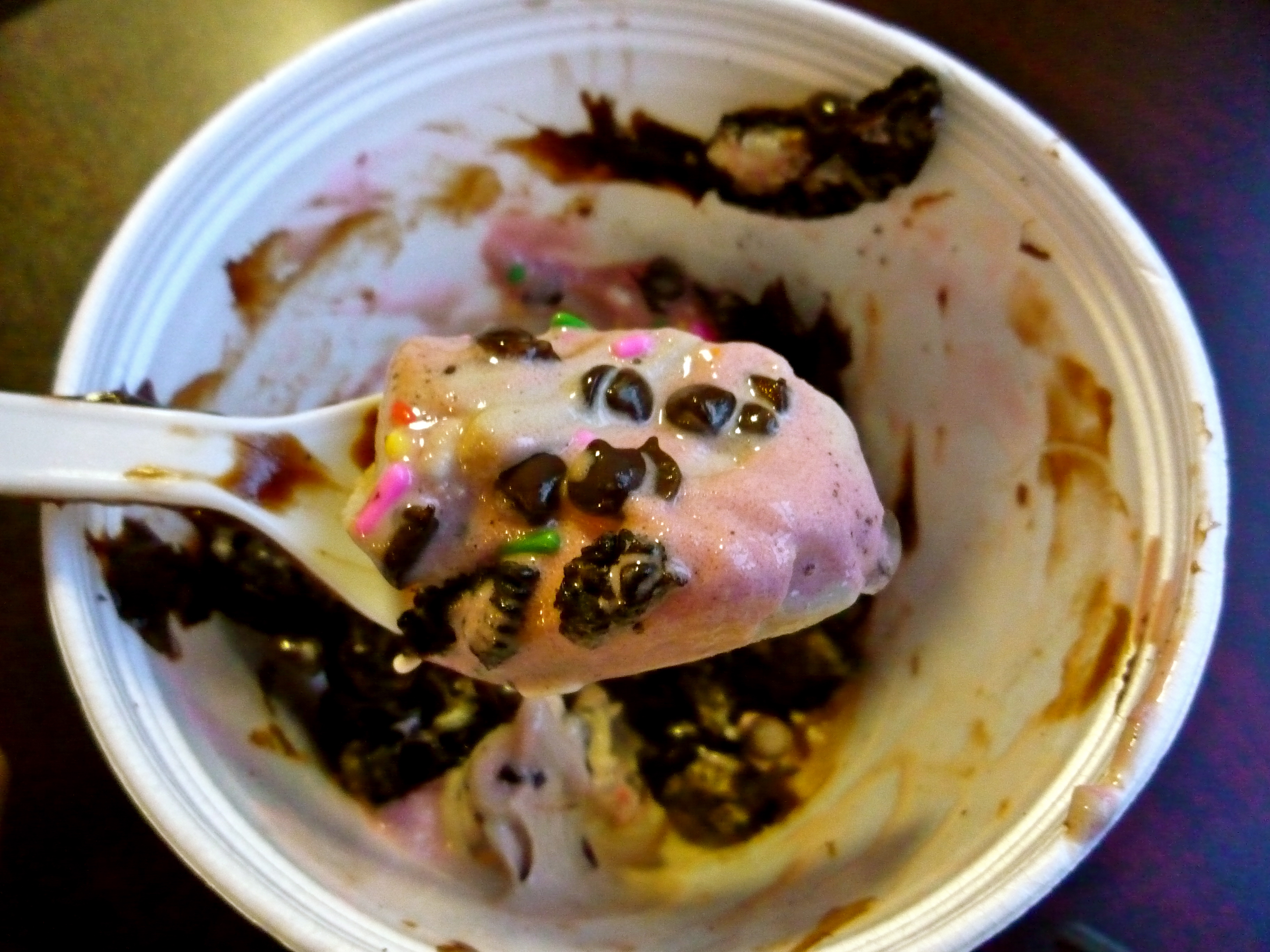 This time, I enjoyed cookies and cream fro-yo + raspberry sorbet. I then topped that off with sprinkles, mini chocolate chips, crushed Oreos, and hot fudge. It was seriously good.