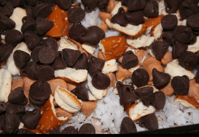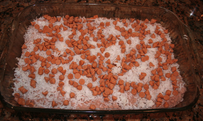 - Top with coconut, butterscotch chips, chocolate chips, and pretzels, creating a layer of each.