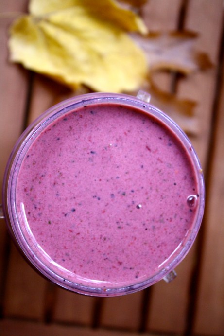 For some reason, purple is a very Halloween color to me, so I thought I’d get creative with my photography and put the purple-y smoothie next to some pretty fall leaves. 🙂