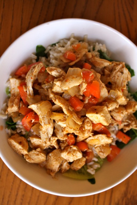 Another fantastic dinner was this sort of chicken taco salad. Basically, I sauteed a red bell pepper with about half a cup of onion until they were both soft. I then sprinkled some homemade taco seasoning (chili powder, cayenne pepper, oregano, pepper, and cumin) on top, and threw in maybe 1/3 cup of water. To that, I added about 4 shredded chicken breasts. I let that all cook until it came together, then added that, some brown rice, and salsa to some lettuce!