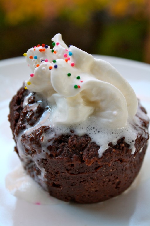 The second was plopped out of the mug and onto a plate for picture taking. I then impatiently put the whipped cream and sprinkles on top….and it all melted before I could get a good picture of it.