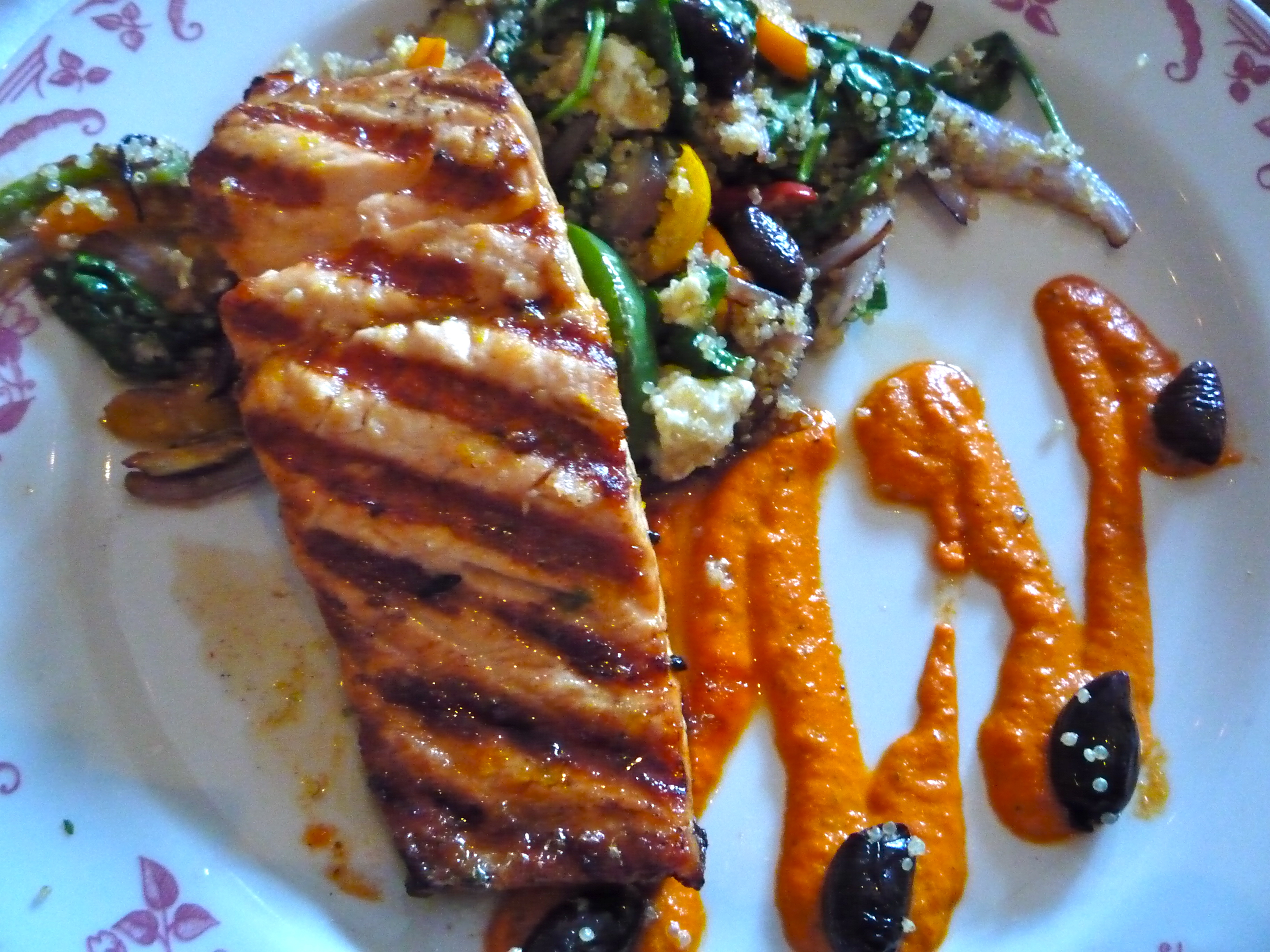 wood-grilled over Mediterranean quinoa, artichokes, red onion, bell peppers, feta, baby spinach, kalamata olives, citrus glaze, red bell pepper coulis