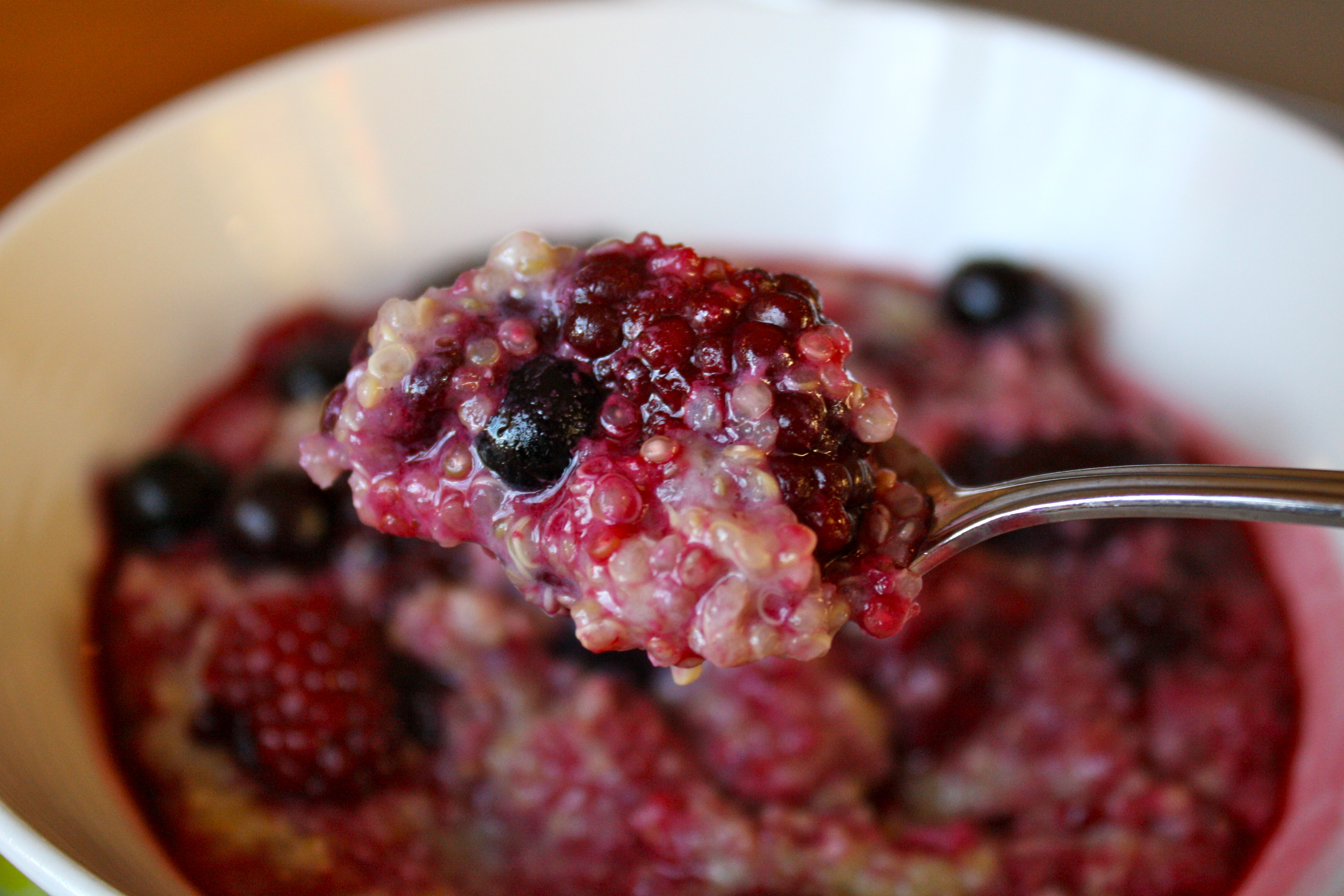 - Spoon the quinoa into a bowl. Pour the berries and juice over top, and serve warm.