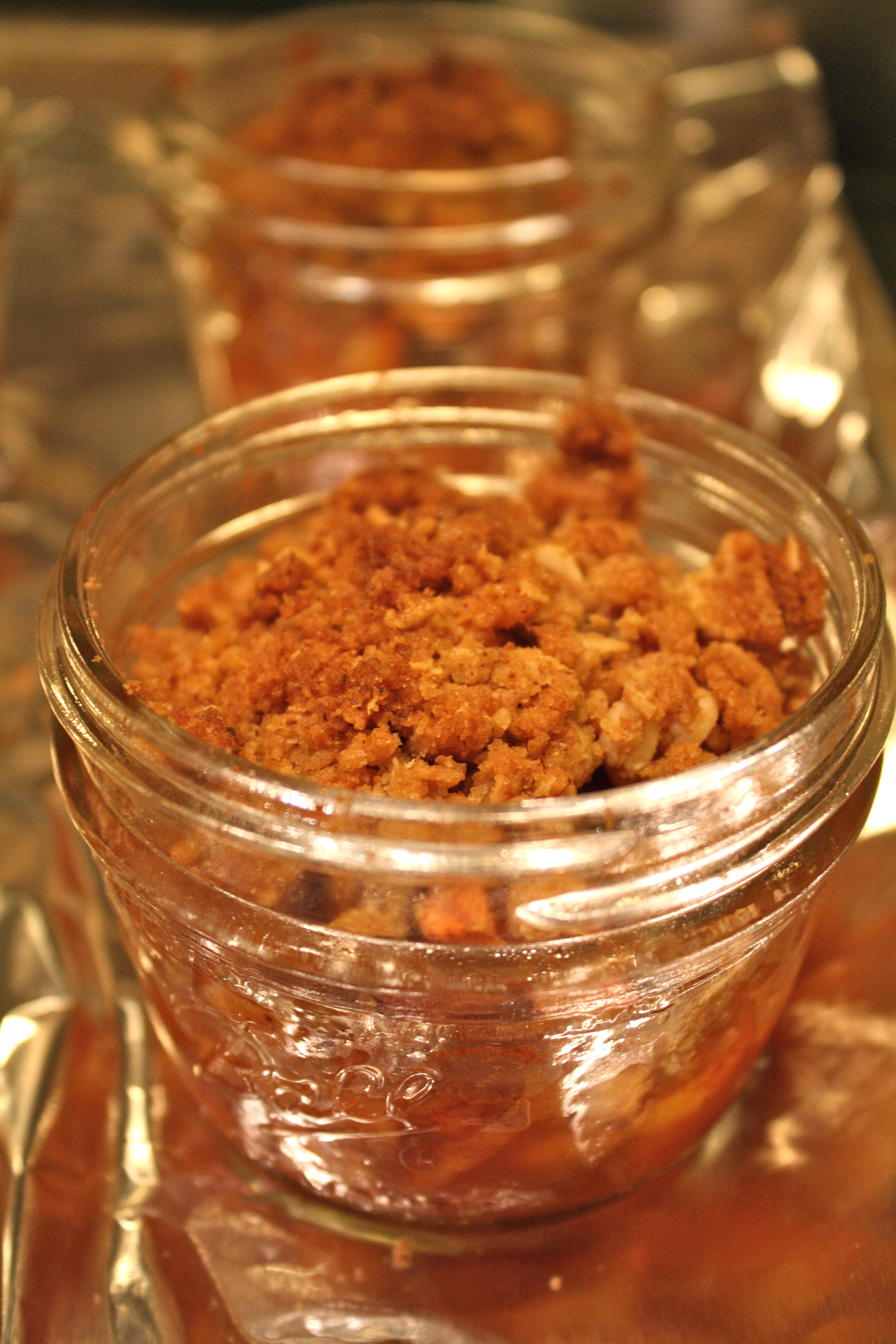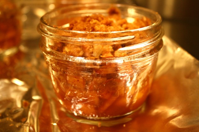 - Spoon a quarter of the apple mixture into each jar, and top with a quarter of the crumble mixture. Place the jars on a foil-lined baking sheet, and bake for about 30-40 minutes, or until the apples are tender and the crumble topping is brown and crisp.