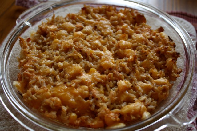 The first time I made it was with brown rice. I mixed together the rice and the enchilada filling, popped it into the toaster oven for about 15 minutes, then tore up some cheddar cheese and toasted it some more. Ohhhhh my goodness it was incredible! I enjoyed some mixed veggies on the side both times I made the “casserole”.