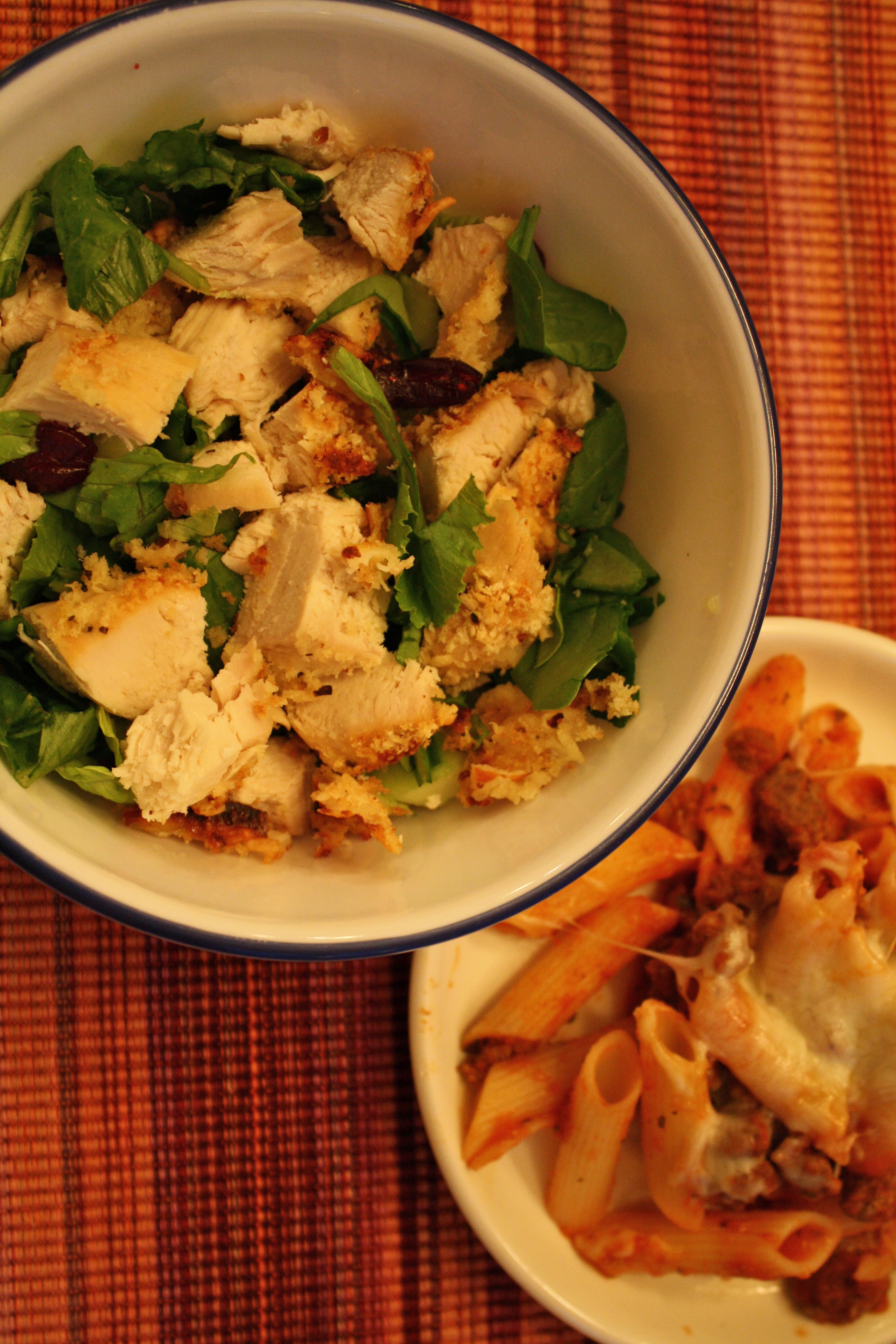 With a leftover parmesan chicken breast, I made this fantastic salad. I chopped up the chicken and added it to a bowl of mixed greens, Craisins, and cucumber, and topped it with balsamic vinegar.