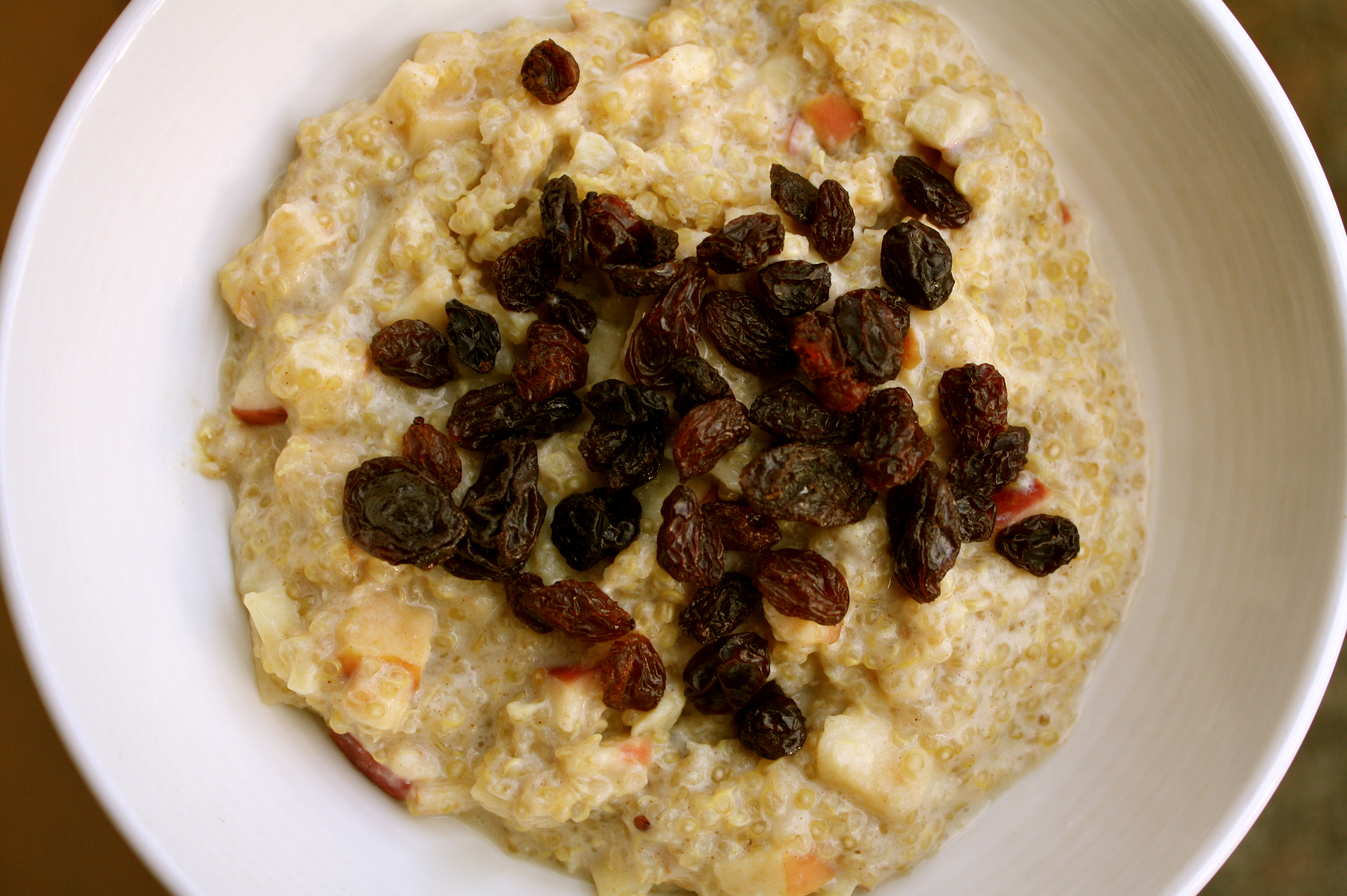 - Spoon the quinoa into a bowl. Sprinkle the raisins over the top, and serve warm.