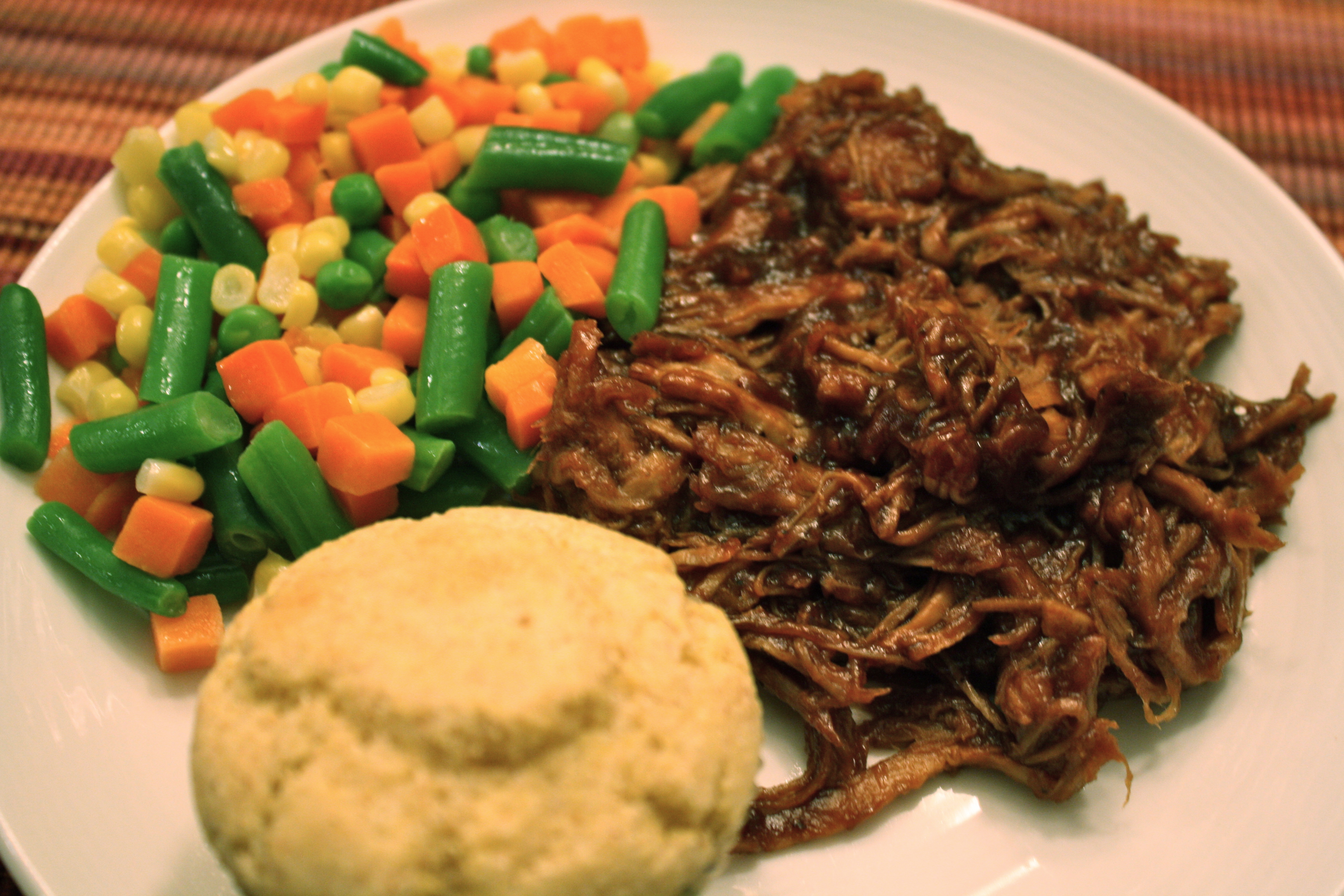 BBQ Pulled Pork (this stuff is sooooo good), mixed veggies, and corn bread muffin(s).