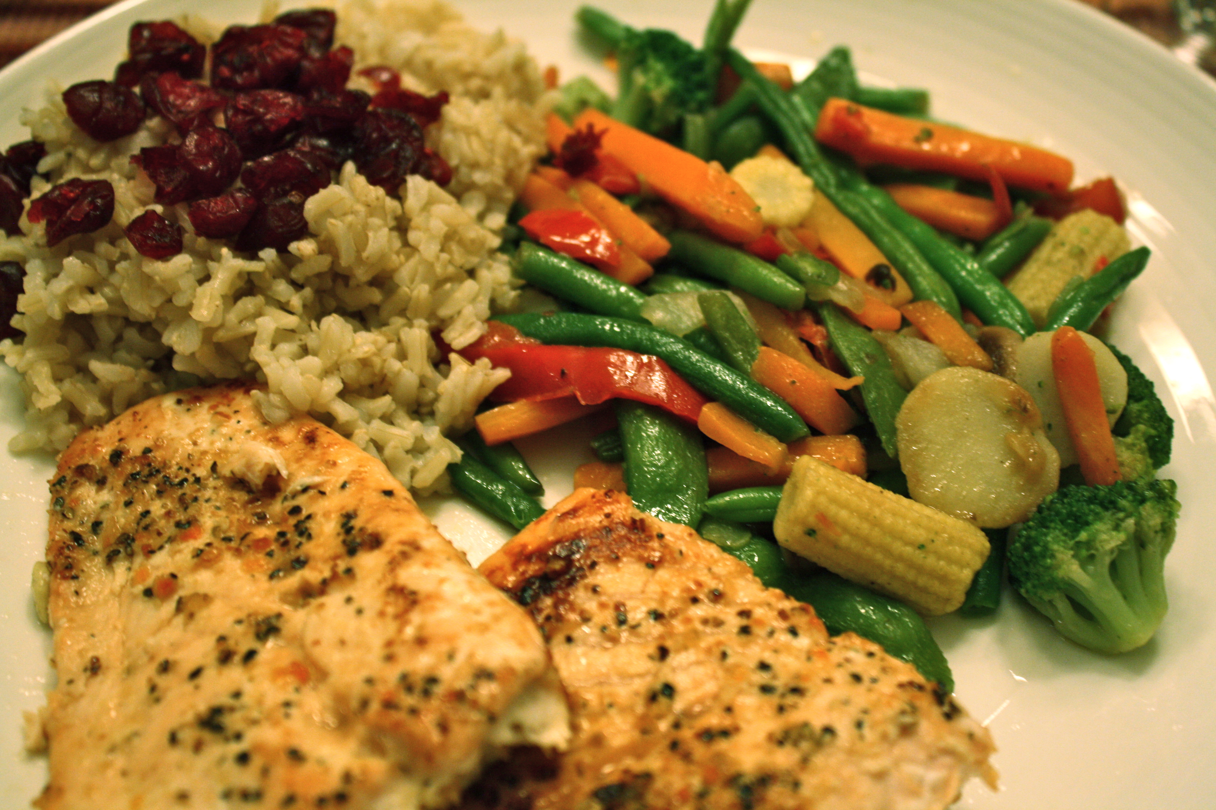Salmon, stir-fry veggies, and brown rice with Craisins.