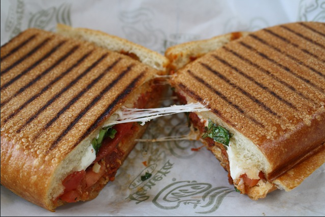 A tomato and mozzarella panino from Panera, with a side salad. Yumo.