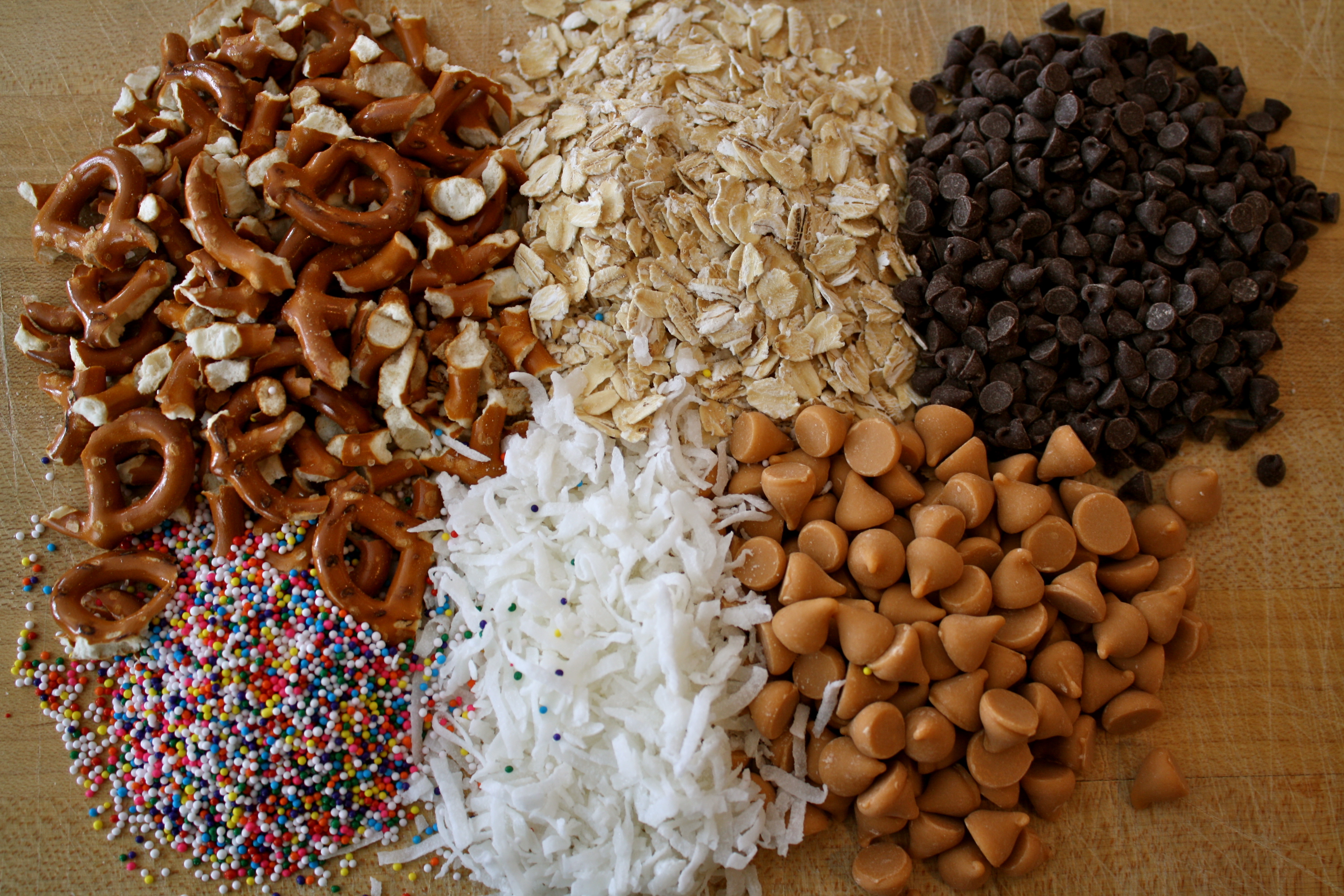 I searched through our pantry and eventually grabbed six different additions to add to a regular cookie base. The suspects? Pretzels, oats, mini chocolate chips, sprinkles, coconut, and butterscotch chips.